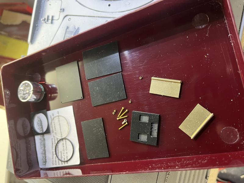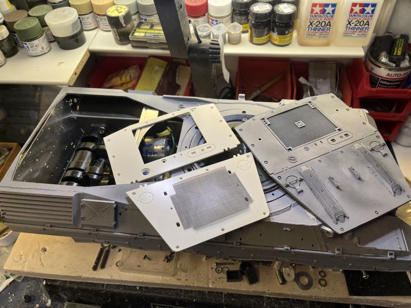 also die nagelneuen Auspuffgrätings liegen noch neben dem geteilten Motordeck in der grossen Kiste mit AFV Teilen , ich war bis jetzt nur zu bequem die alten Auspuffgrätings abzuflexen.