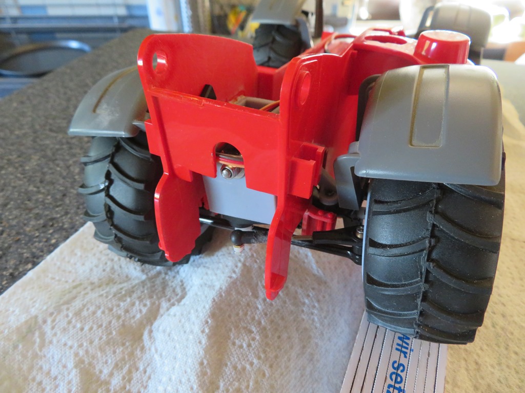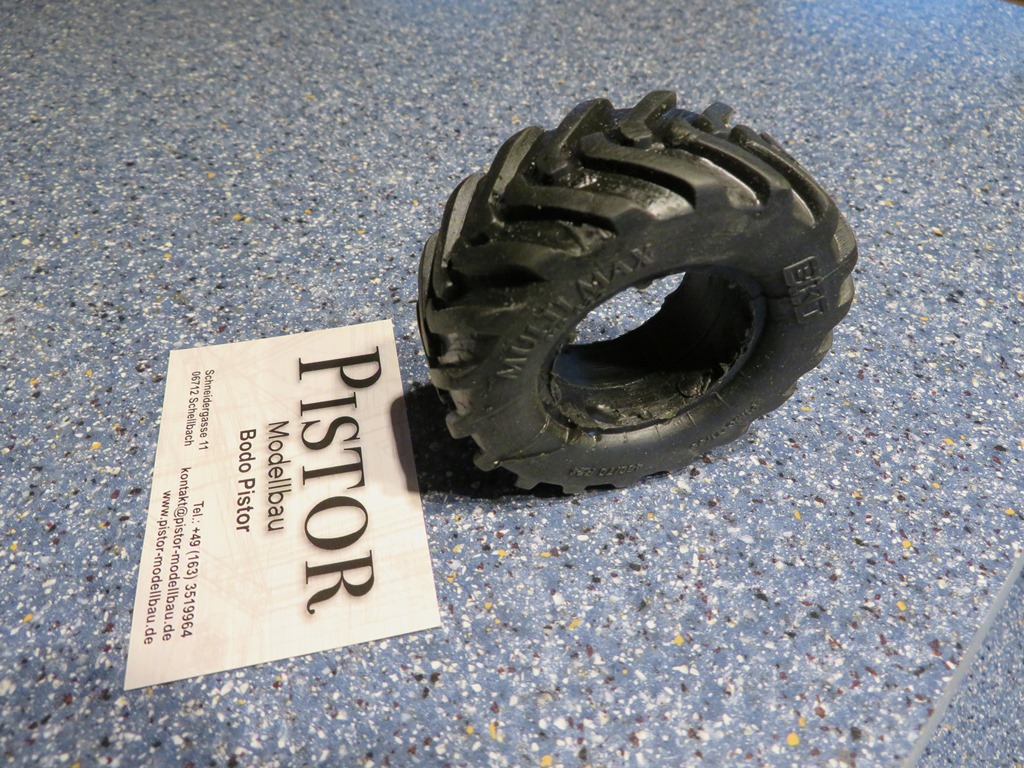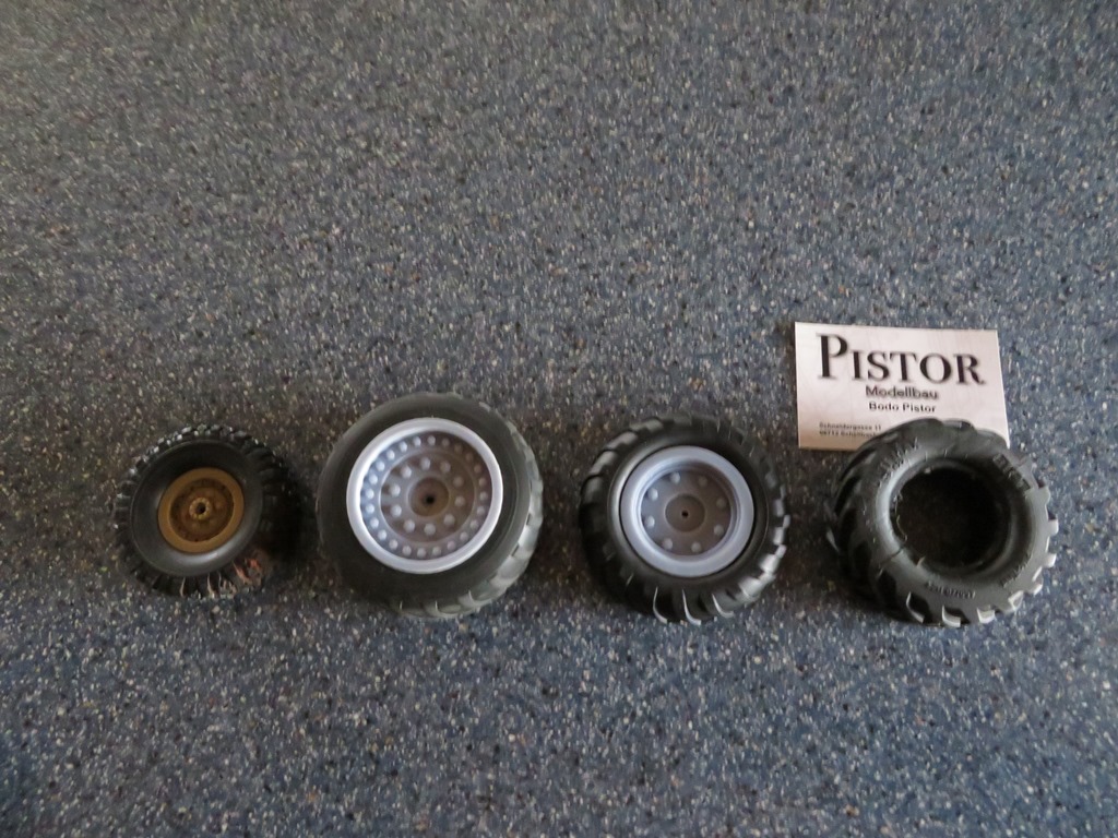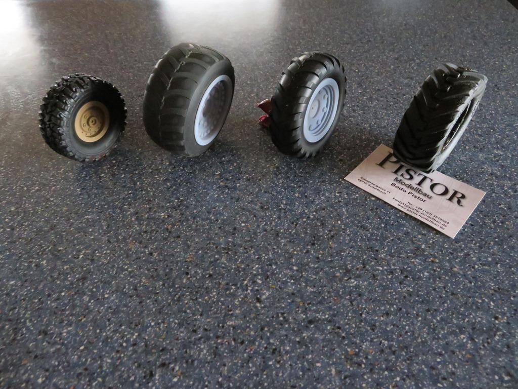 Da die Original Reifen defintiv nicht zu verwenden waren, habe ich mich im ersten Schritt für Gummi Reifen entschieden welche bei Bruder Traktoren zu Einsatz kommen. Diese waren im Durchmesser und breite sehr nah. Im Zuge des Projektes bermerte ich aber, das hier das Bruder Modell vom Manitou nicht angelenkt war und der Reifeneinschlag nicht zusammen passte. Somit durchsuchte ich sehr lange das Web nach passenden Reifen.