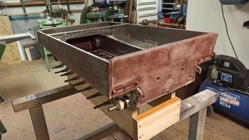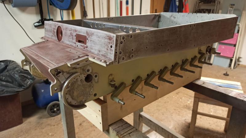 Nach einer kleinen Weihnachtspause ging es diese Woche weiter. Alle bereits an der Unterwanne montierten Kleinteile wurde entfernt und entlackt, die Wanne wurde komplett geschliffen und neu gespachtelt. Die Federung wurde bereits im Vorfeld korrekt eingestellt und geschmiert.