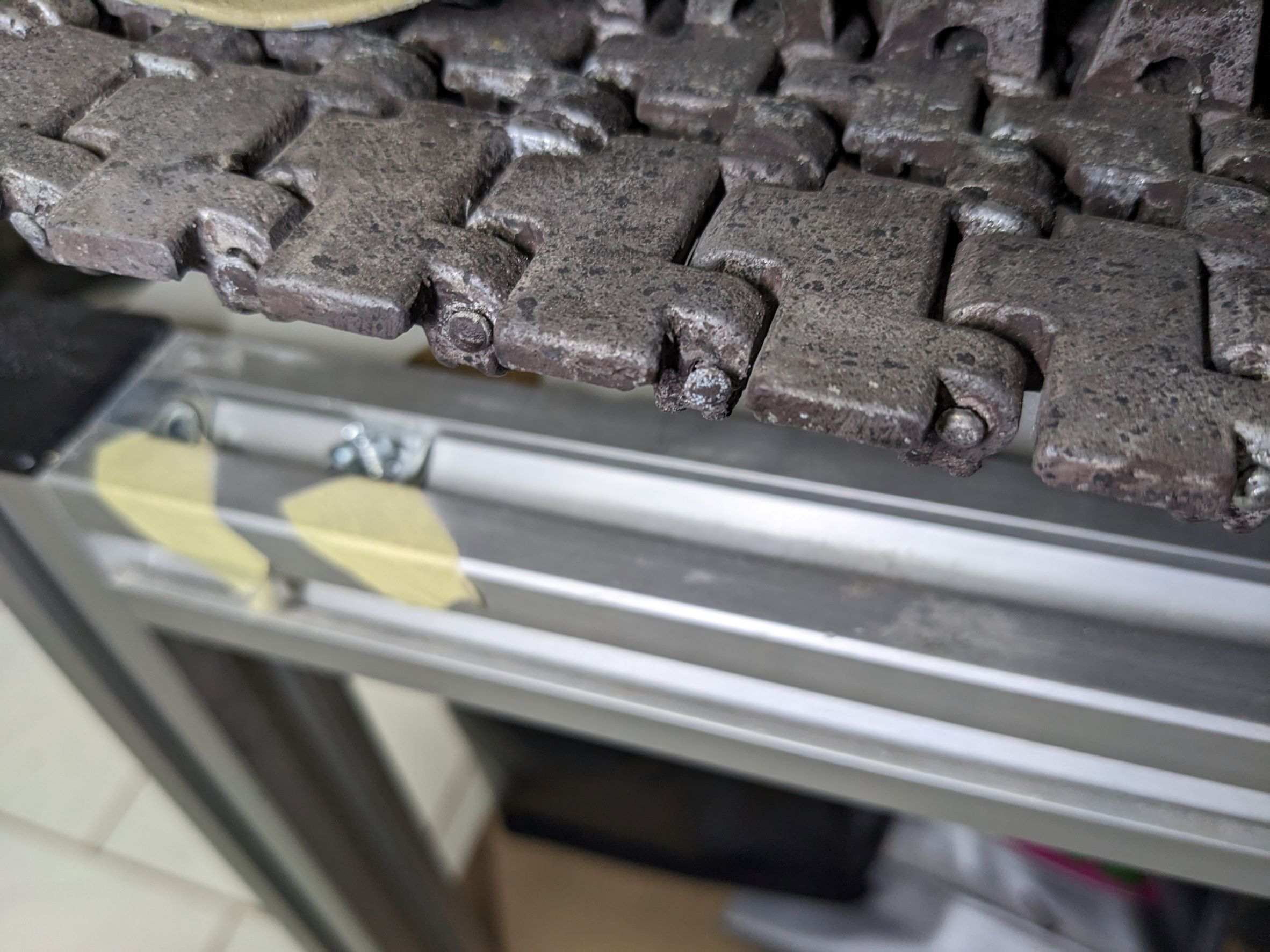 Und ja, der orangerote Kasten besteht aus 2 simplen PVC-Platten, mit Heißkleber eingesetzt, und ist eine einfache, aber wirksame Möglichkeit, Wasser und Schmutz vom Inneren der Wanne abzuhalten, das sonst freien Zugang über die Langlöcher hätte. Das Innere des Kastens kann jetzt getrost verschmutzen; es lässt sich notfalls über die Langlöcher mit Druckluft oder Wasserschlauch säubern. Die dicke Eisenachse der Leiträder mag bei häufigen Wasserfahrten mit der Zeit vllt ein wenig Flugrost ansetzen, aber das beeinträchtigt die Funktion sicher nicht. Lediglich die Schrauben für die Kettenspannung habe ich vorsichtshalber durch Edelstahl-Schrauben ersetzt und mit ordentlich Fett eingesetzt. Man darf dabei natürlich immer nur eine auf einmal rausschrauben, sonst dreht und verschiebt sich die Achse und man hat wegen des Kastens Schwierigkeiten, die Löcher wieder zu finden.