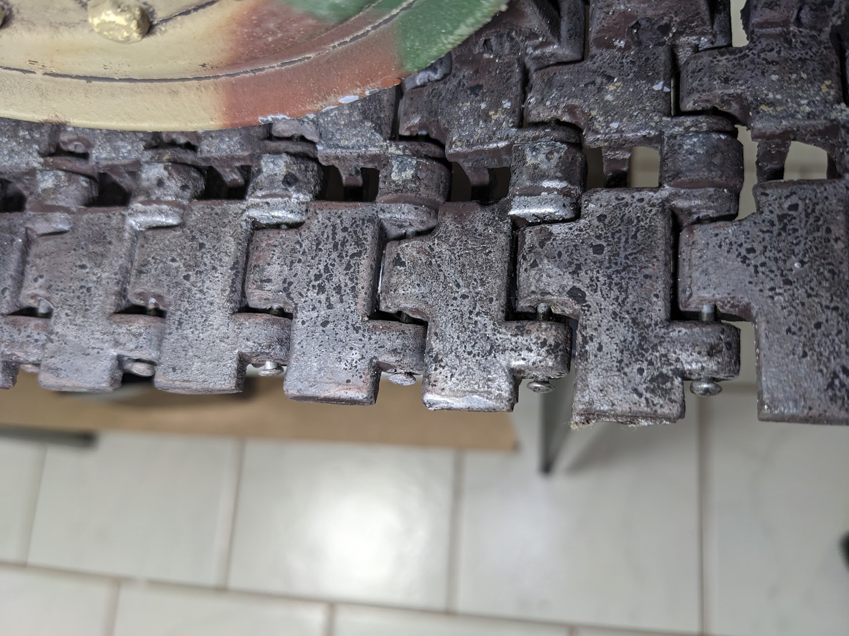 hmmm, also ich weiß nicht. Für Lack sieht das aus der Nähe schon reichlich fleckig aus. Am ehesten sollte das an den Kettenbolzen feststellbar sein. Das sind ja eigentlich metallisch blanke Fahrradspeichen, siehe das umgebogene Ende auf dem Foto. Bei Lack sollte die Oberfläche nahezu glatt bleiben; von Säure würde sie angefressen werden, je nach Einwirkdauer.