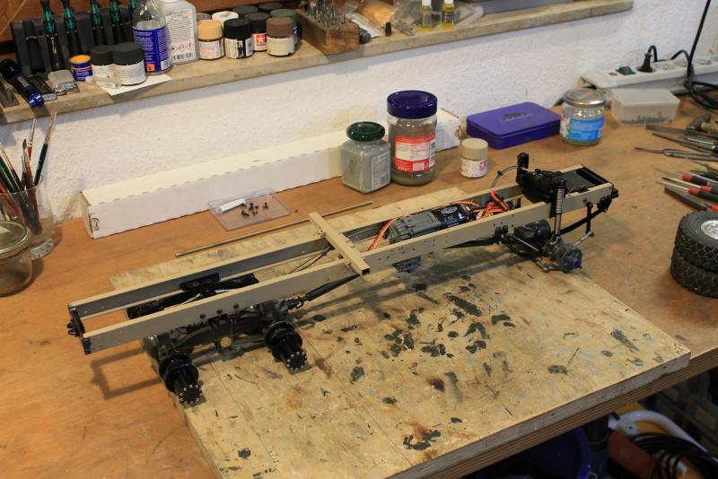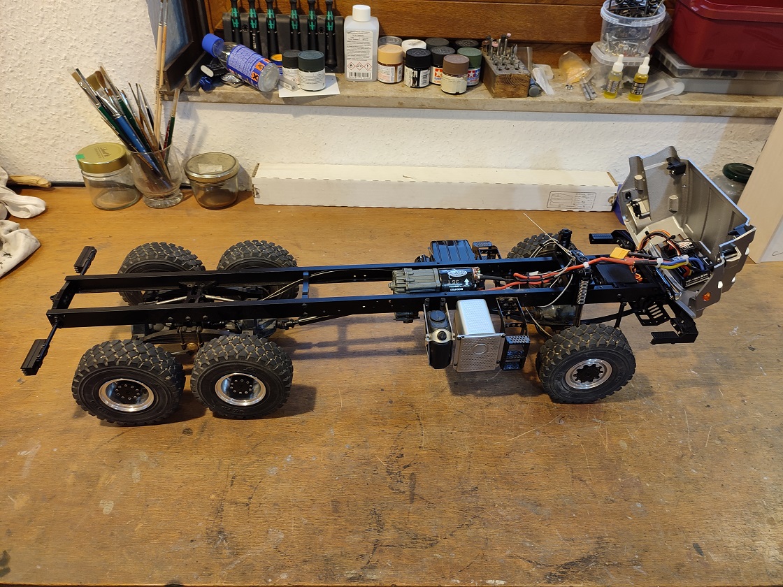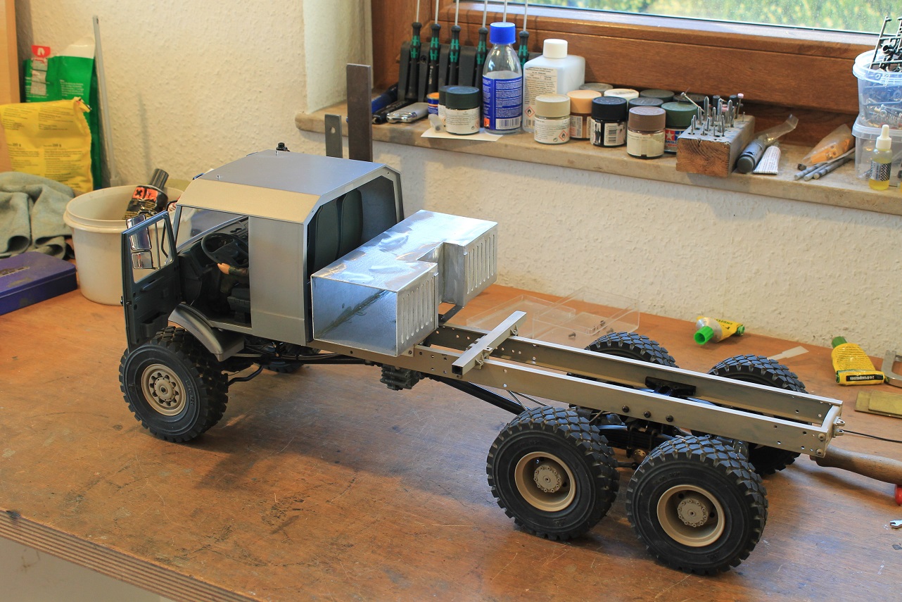 Das Chassis steht wieder auf den Rädern. Ging einfacher wie gedacht. Als nächstes ist die große Staukiste zwischen Fahrerhaus und Pritsche an der Reihe. Hier möchte ich die ganzen Elektrokomponenten unterbringen.