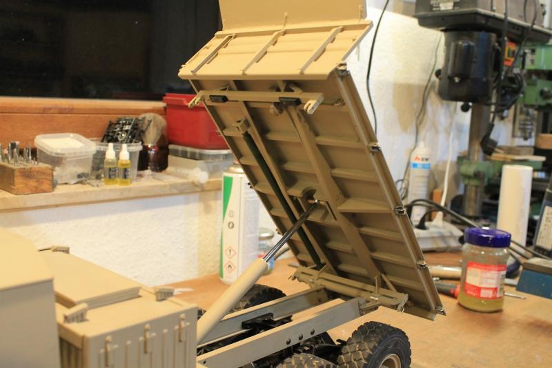 Für den "Zylinder" der Pritsche hatte ich am Anfang vor, einen Hydraulikzylinder zu nehmen - zumal bei dem Modell ein Öltank mit dabei ist. Aber wo alles unterbringen? Da es einen gut funktionierenden Teleskopzylinder für diese Maßstäbe aus meiner Sicht nicht gibt, war schnell klar: Ich nehme einen Elektrozylinder von Sicon mit CTI Regler (da eine 3-Seitenkippfunktion sowieso nicht darstellbar ist). Bei diesem Regler benötigt man keine Endlagenabschaltung. Das funktioniert einwandfrei. Auch sind genug Kraftreserven da - und kein Ölgekleckere.