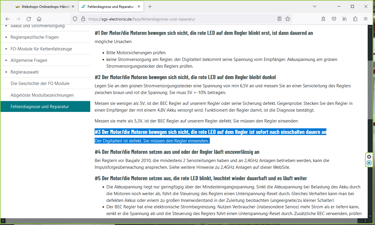 die rote LED zeigt i. Allg. Überstrom oder Übertemperatur an. Könnte eine Motorzuleitung einen Kurzschluß haben? Ist der Fahrakku voll oder bricht dessen Spannung ein, wenn die Motoren anlaufen sollen?