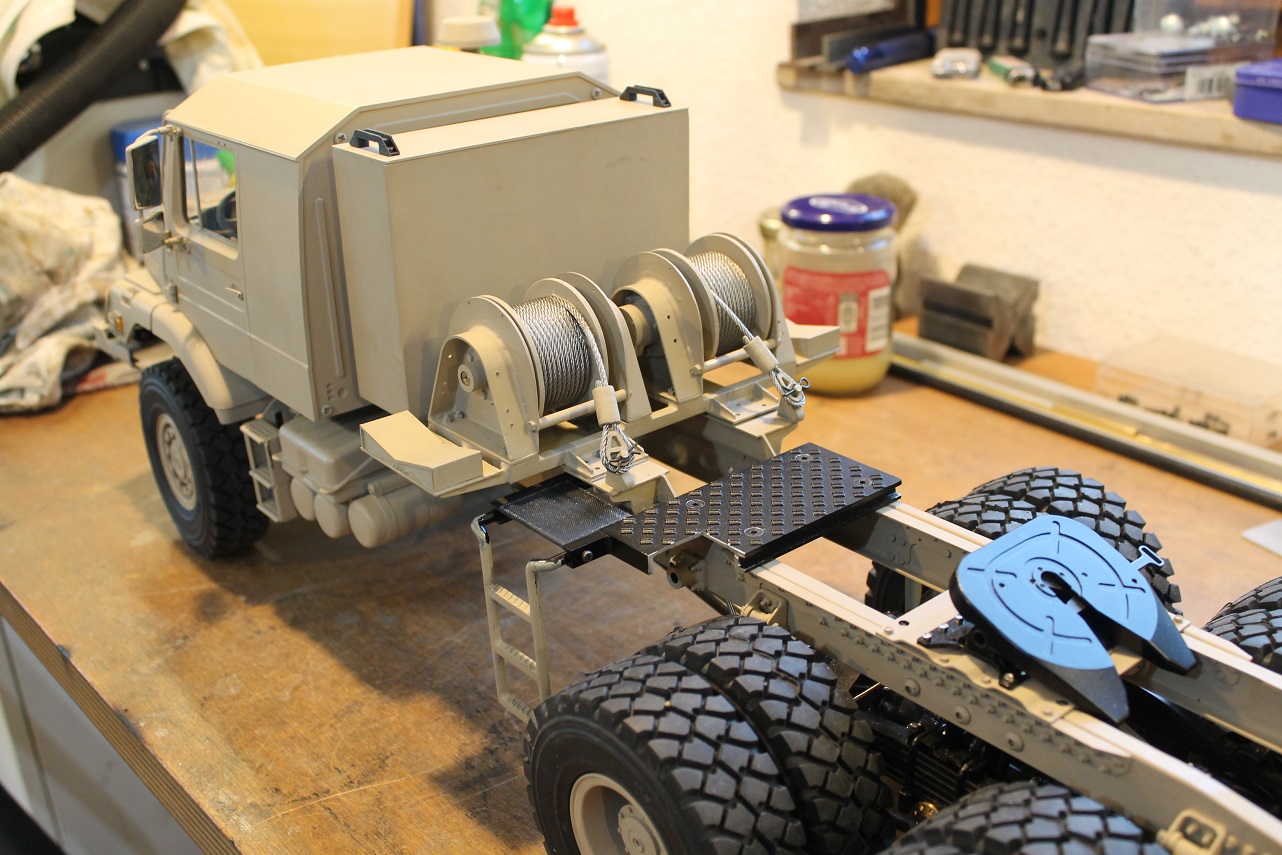 Die Seilwinden sind nun auch an ihrem Platz. Da ich ein 2 mm Stahlseil verwenden wollte, machte für mich ein Antrieb der Seilwinden keinen Sinn. Auch sollte man sich nicht täuschen lassen, auf jeder Trommel sind 5 m Stahlseil. Die Leiter und die Plattform hinter den Seilwinden ist vom Ursprungsmodell.