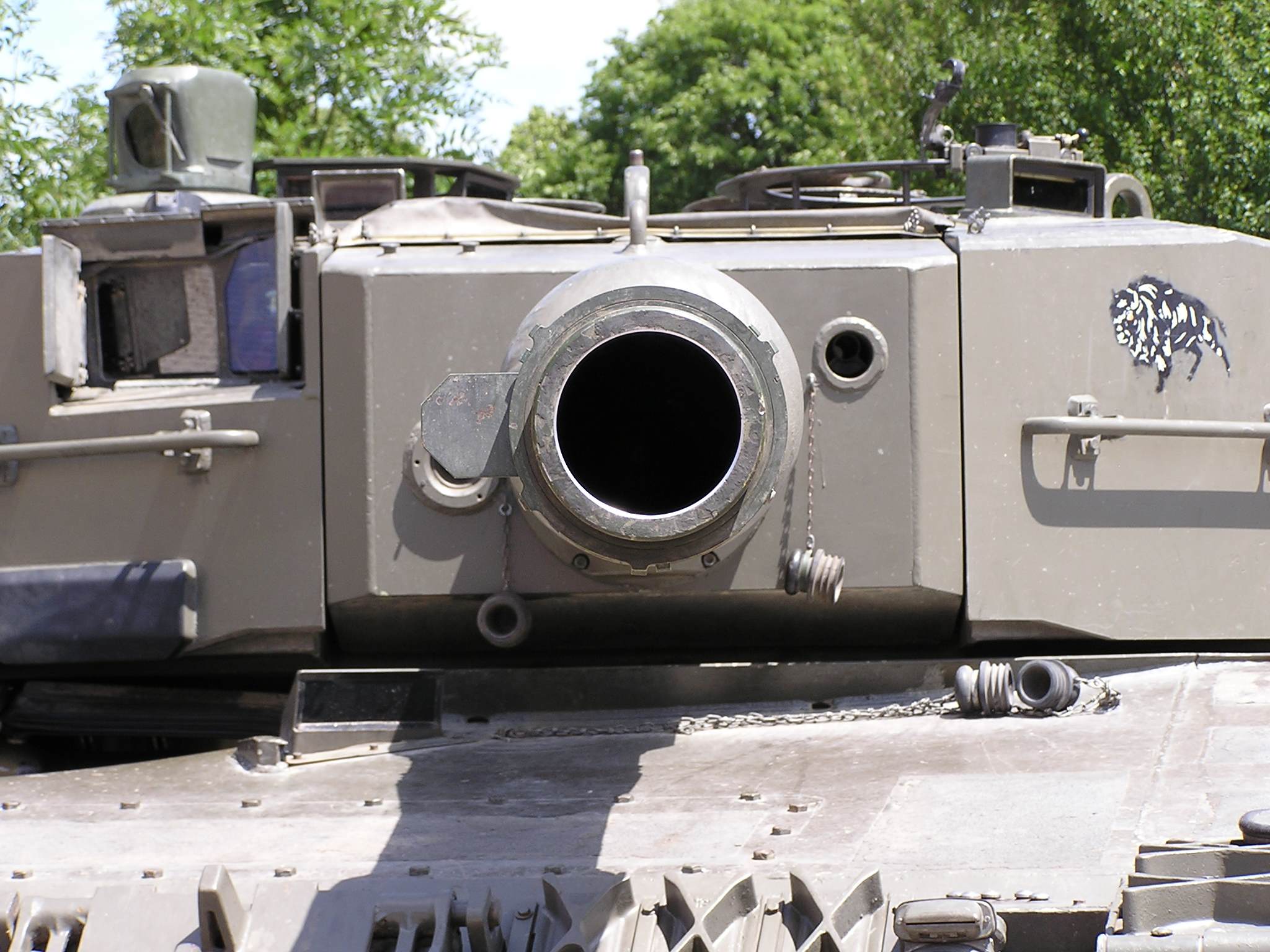 Die Panzerblende, das Teil mit der dem Koax-MG und der Zieloptik. Die Unterkante der Blende reicht nicht (bei Rohrstellung 0° Höhe) nicht bis zur Unterkante des Turms.