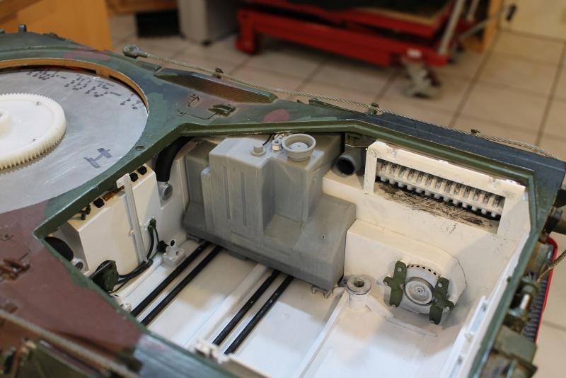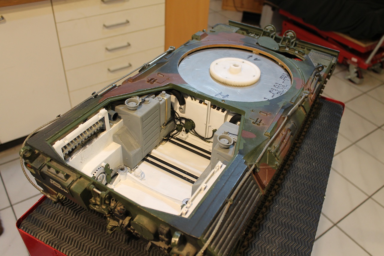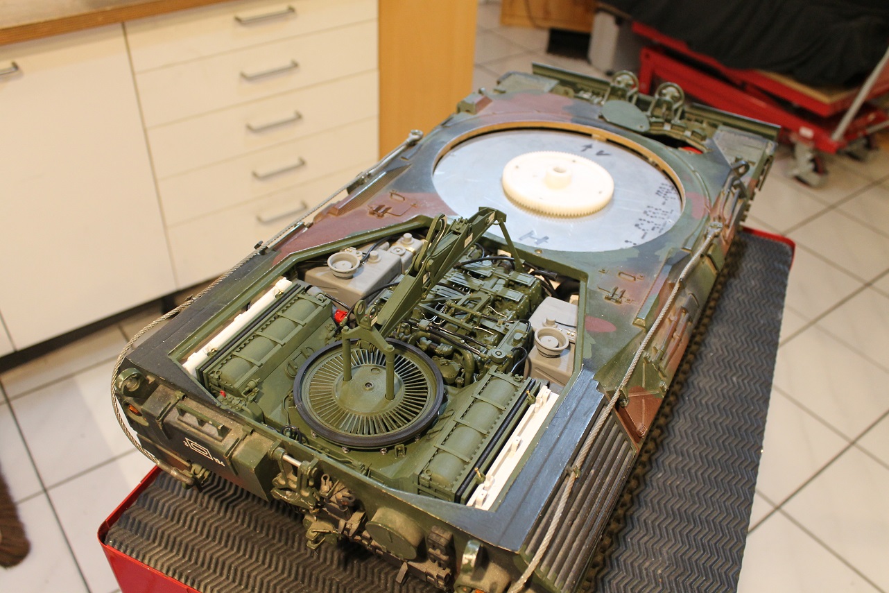 Aber dann kommt noch der Berge-Leo. Die Front paßt gar nicht und damit die Anlenkung von Räum-/Stützschild. Eine Drehstabfederung wäre mir auch lieber. Also komplett neu aufbauen und nur die Details außen und den Arm verwenden?
