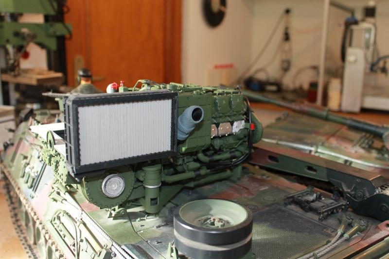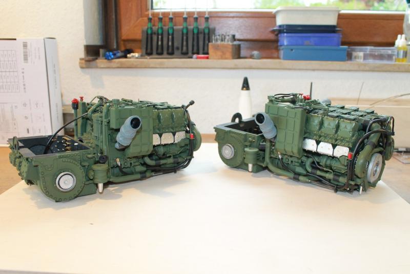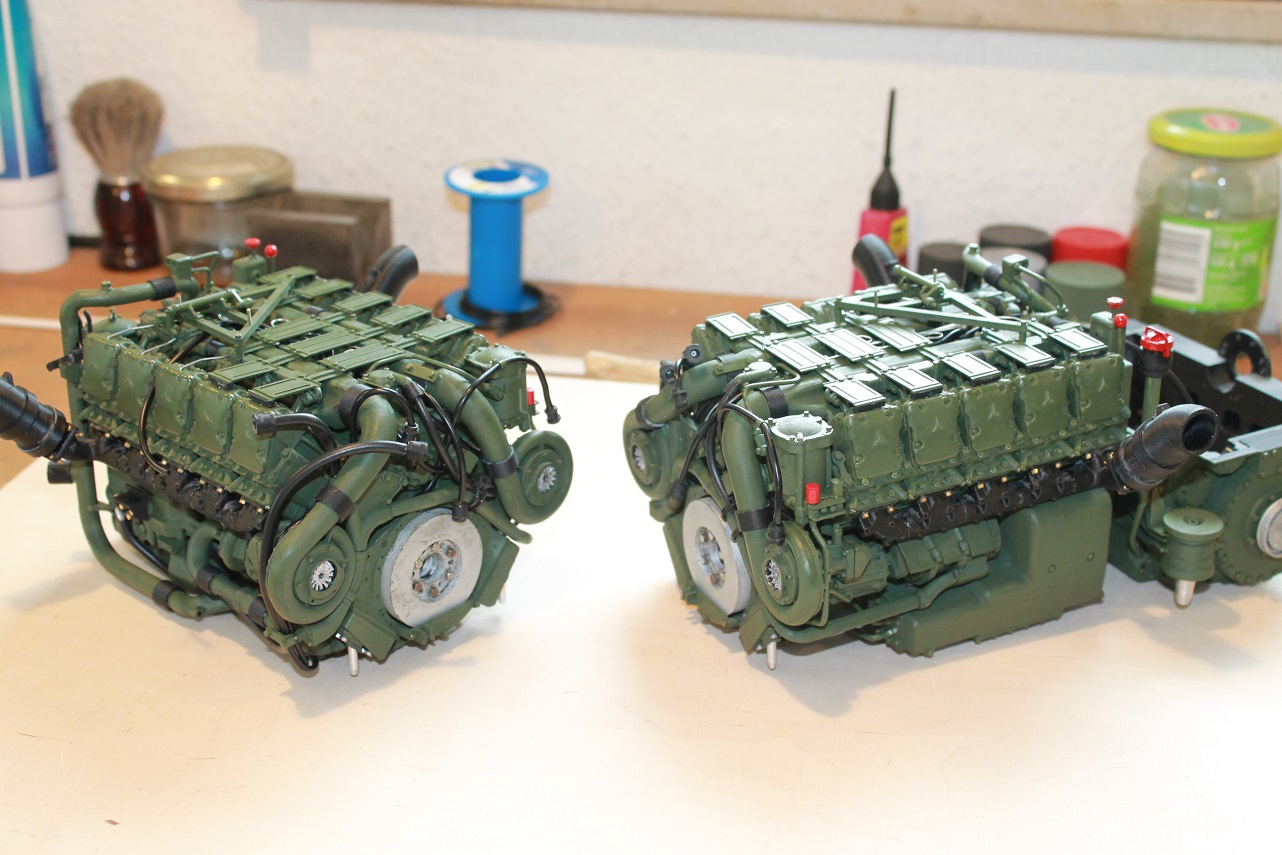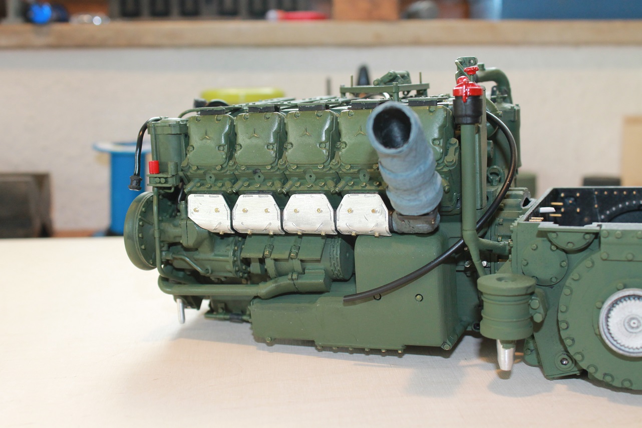 Der Motor ist nun auch fertig. Soweit ich das machen kann. Zwei Baugruppen fehlen: Die Kabel für die Brandunterdrückungsanlage (das wären 0,1 mm Leitungen) und die Glühkerzen samt Leitungen. Bei den Glühkerzenleitungen, weiß ich nicht wohin diese führen. Und im Nirgendwo Kabel enden zu lassen ist nicht meine Art. Dann besser nicht andeuten.