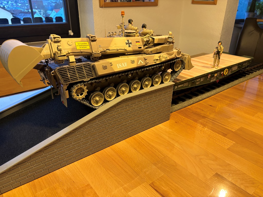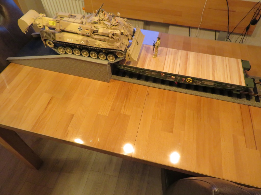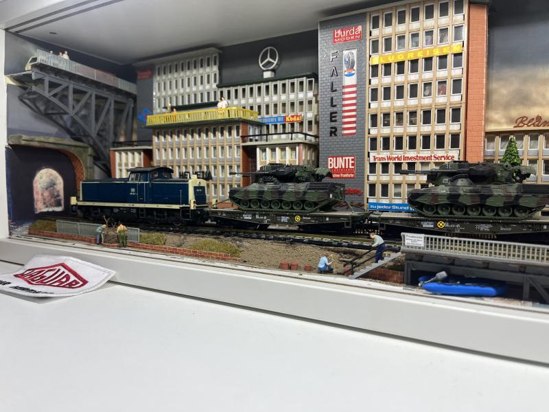 Ich habe aus meinen Jugendzeitresten 1975 ein Diorama gebaut , also nicht so genau hinschauen und dann den Flachwagenzug mit Zugfahrzeug versehen , wird es sowas ?