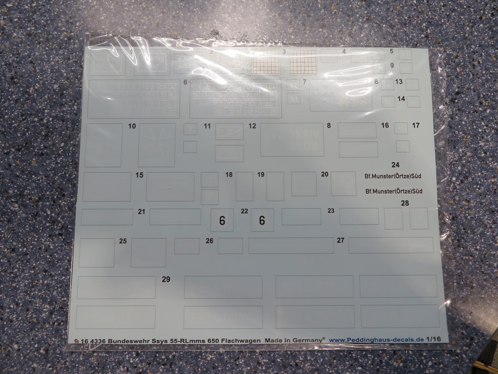 Im nächsten Schritt folgen die Decals für den Flachwagen, welche ich wie schon anfangs beschrieben von Hr. Peddighaus auf den Maßstab 1:16 hoch scalieren habe lassen. Das Rad muss ja nicht immer neu erfunden werden.