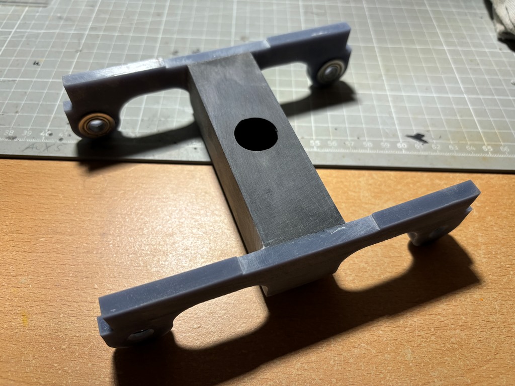Zur Überprüfung des theoretischen Antriebs Konzeptes habe ich mir einen Querträger Dummy gefräst und verklebt.