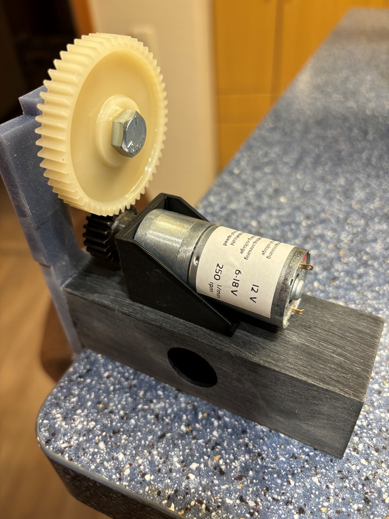 Nun kann man schön real erkennen, wie später mal das Zahnrad welches an das Laufrad geschraubt wird, in den Getriebemotor SG 25