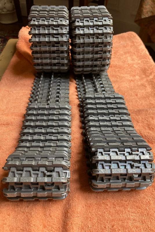 - Ein Paar Metallketten für Tiger I im Maßstab 1/10 (Breite 72,5 mm, Gewicht 1,5 kg x 2), neu: 600 Euro.