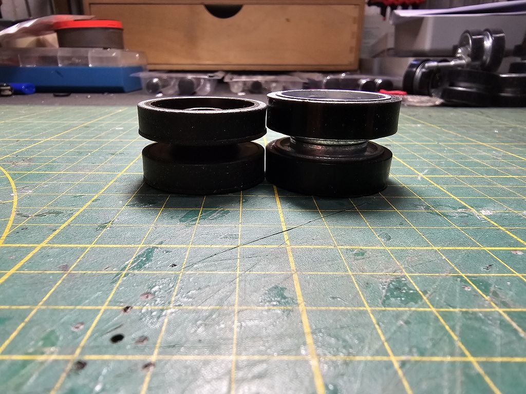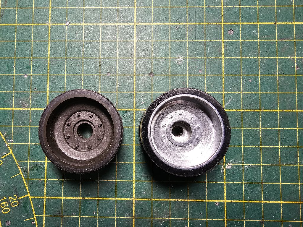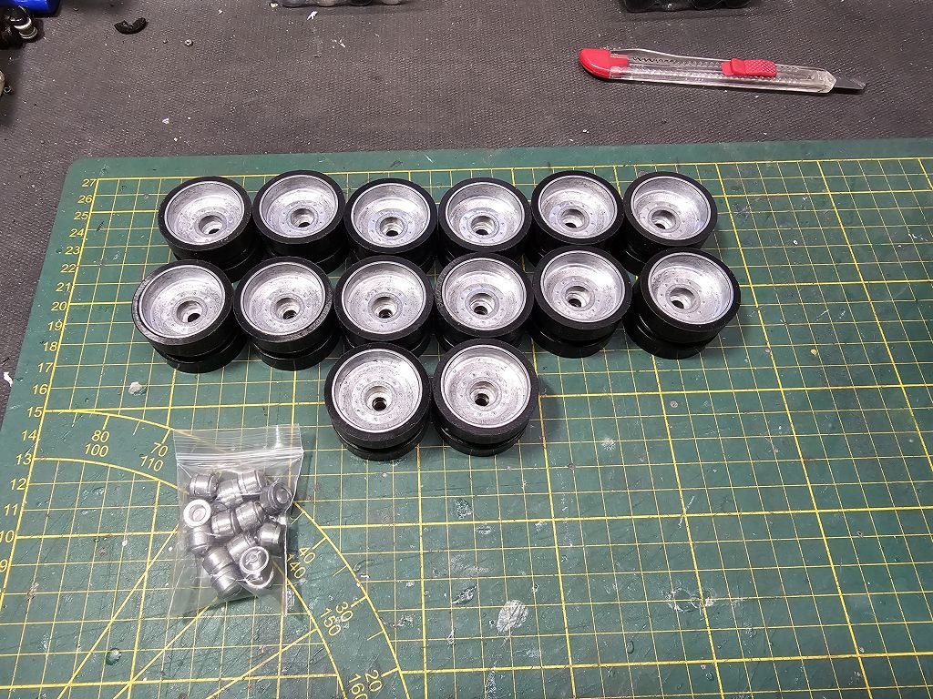 die Tamiya Laufrollen sind ja schon ca. 7mm zu breit ,und jetzt willst Du wirklich noch breitere Rennsportschüsselfelgen draufziehen?