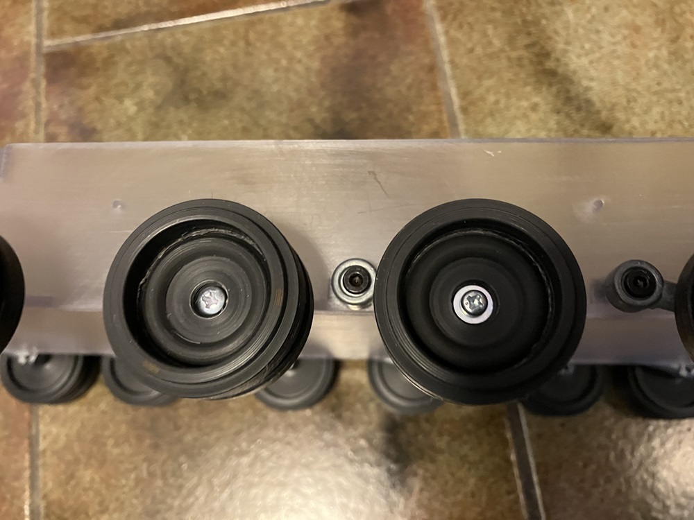 Zunächst hatte ich einen Schreck bekommen, weil die Befestigungspunkte für die Stützrollenhalter nicht zu passen schienen. Tun sie aber. Jedoch müssen die zu den Wannenenden befindlichen, inneren doch viel weiter an die Wannenwände rücken. Sonst kommen sie beim Einfedern den Laufrollen in die Quere.