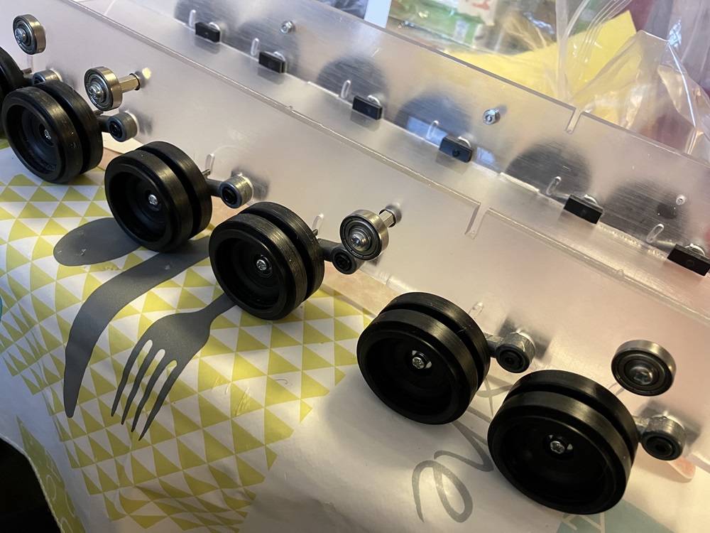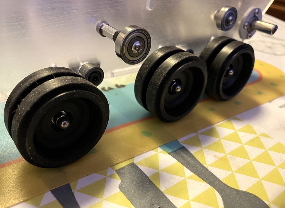 Einige der Rollen sind nicht sauber gedreht und gebohrt, es wird Nacharbeit nötig sein. Es sind nicht mal Befestigungsschrauben für die Laufrollen dabei. Ich habe zunächst simple mit U-Scheibe und Sicherungsring aus dem Fundus genommen. Für die endgültige, hübschere Lösung müsste sich der Eigner etwas überlegen.