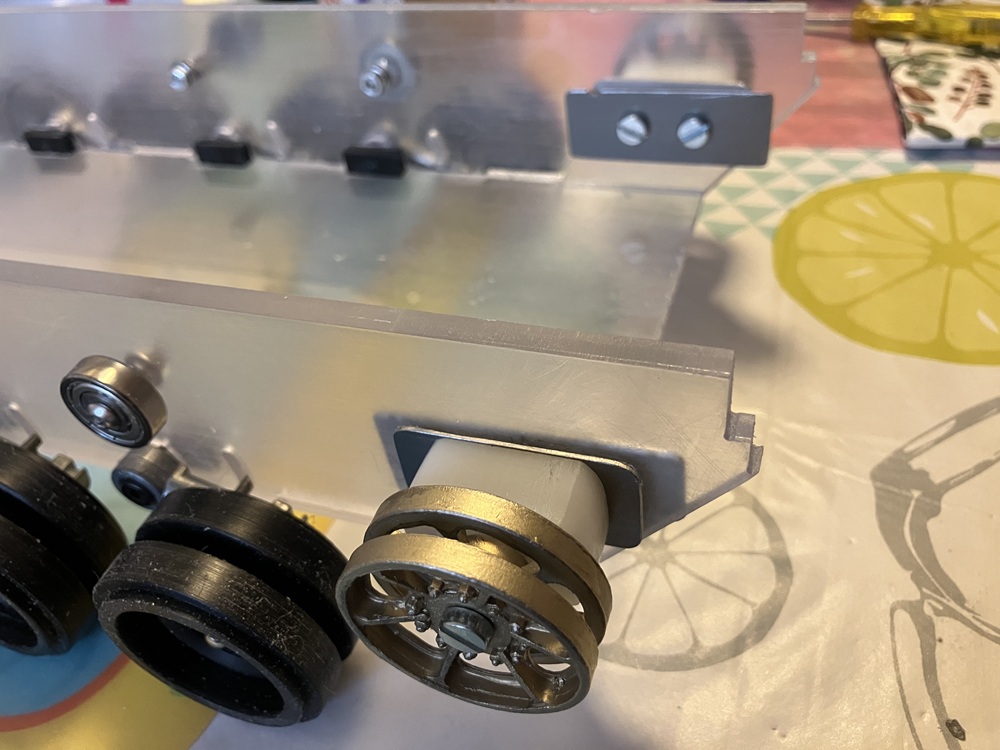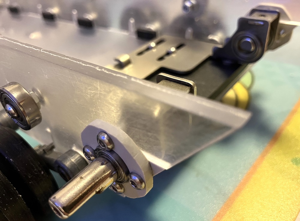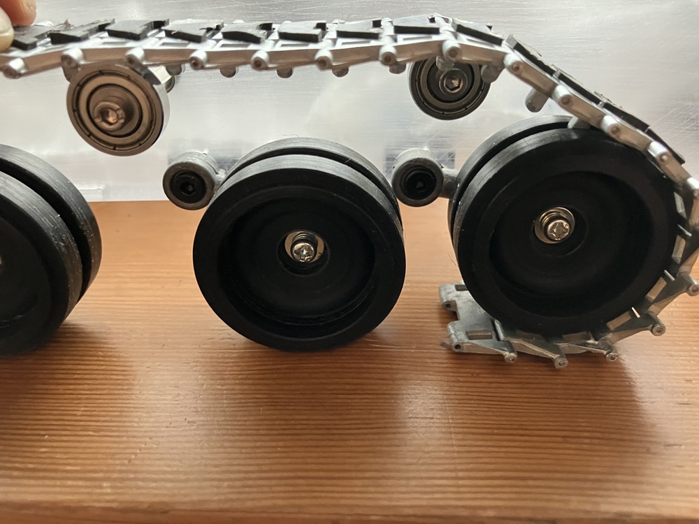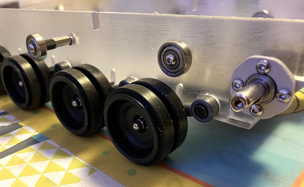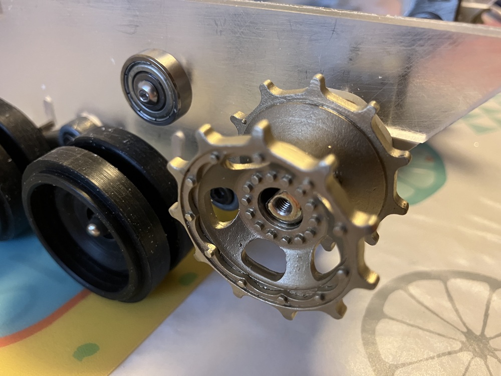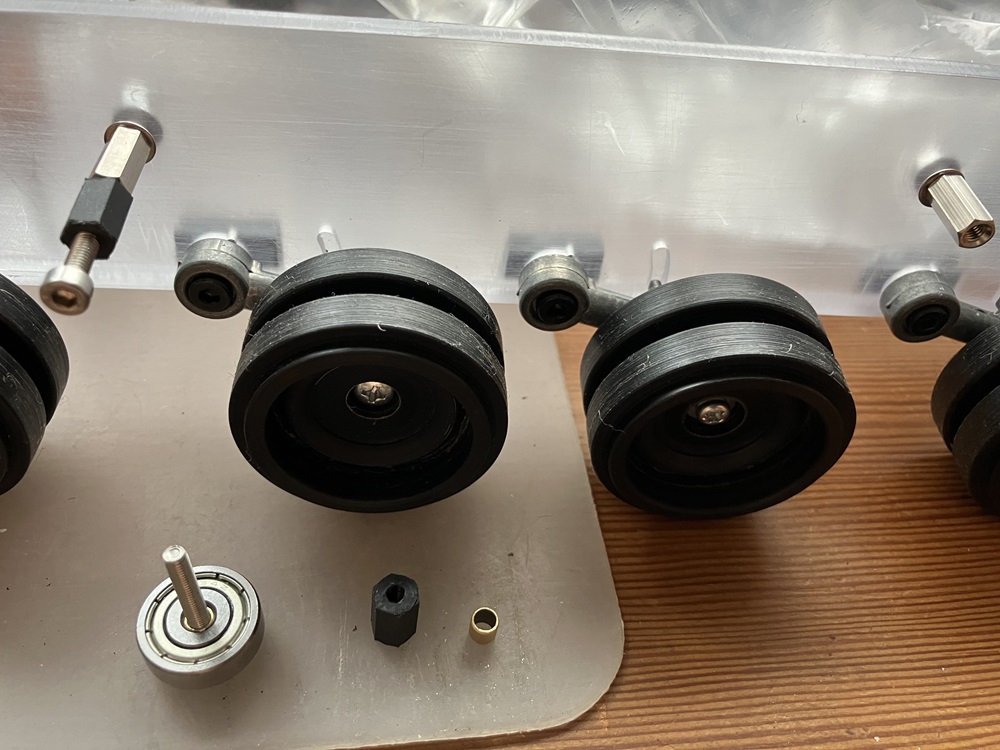 Für die Stützrollen habe ich mich der Einfachheit halber mit dem Besitzer auf schlichte, geschlossene Kugellager geeinigt. Den Durchmesser ermittelte ich anhand von Bildern und Messungen. Angebracht werden sie ebenso einfach mit Distanzbolzen, die sonst Elektronikplatinen befestigen. Dies ist eine schlichte Lösung. Je nach gebauter Version kommen aber eh Kettenschürzen zum Einsatz, dann sieht man von dem ganzen kaum noch etwas.