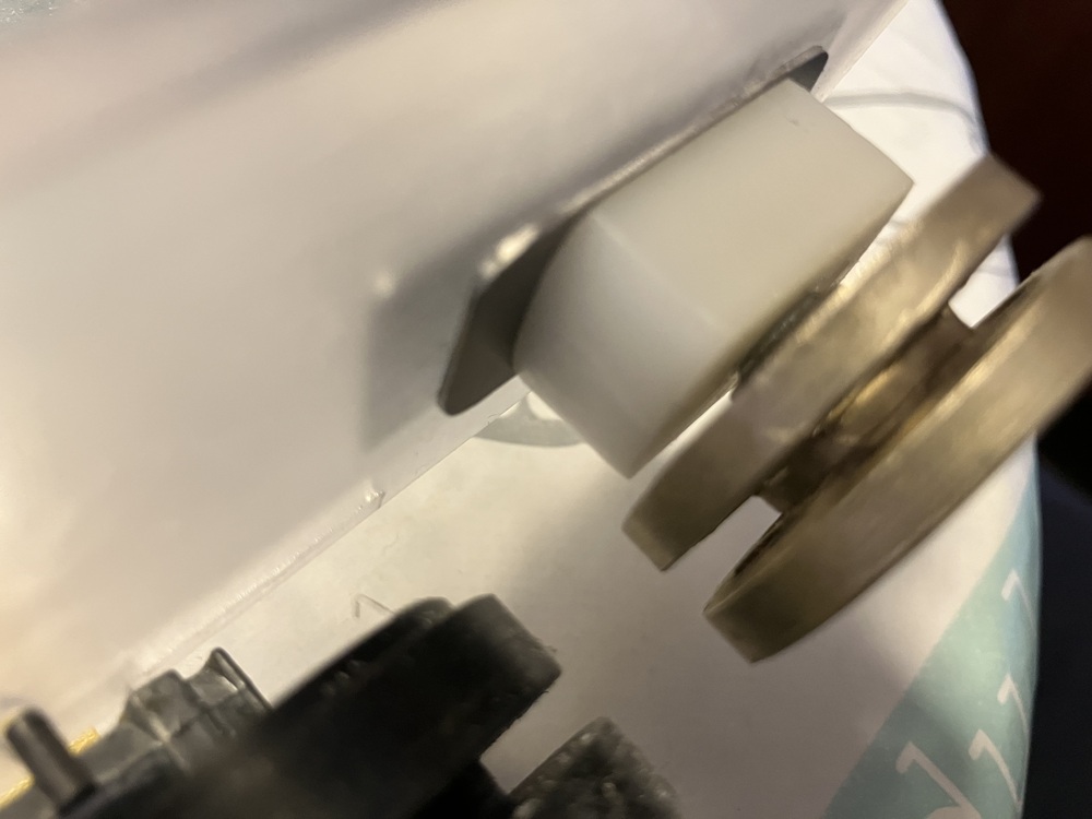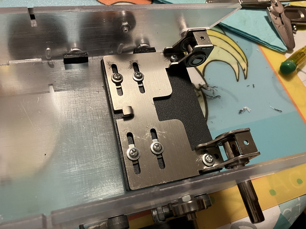 Zum Thema Leitradhalterung/Kettenspanner habe ich vom Eigner nix mit bekommen. An der Wanne gibt es lediglich je einen Piloteinstich an der Stelle, wo die Leitradachsen sind. Also habe ich mir selber etwas ausgedacht. Die simpelste Lösung ist die Traditionelle Achse zwischen den Rädern in Langlöchern. Mit Längs-Stellschrauben. Kann man machen, aber dann kann man streng genommen nur beide Ketten gleich spannen, sonst stehen die Räder schief. Also habe ich eine Zwischenlösung gemacht, ähnlich wie bei meiner Maus. Schiebeblöcke aus Nylon, mit Stahlplättchen, die die Langlöcher verdecken, Kräfte verteilen und Flächenreibung erzeugen. Dafür sind die Bleche mit einem rauen Lack bereits beschichtet gewesen, ein gnädiger Zufall, sonst hätte ich Sandpapier aufgeklebt.