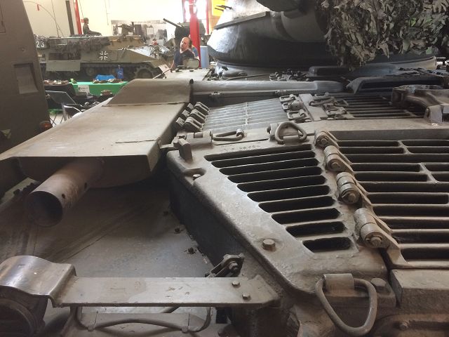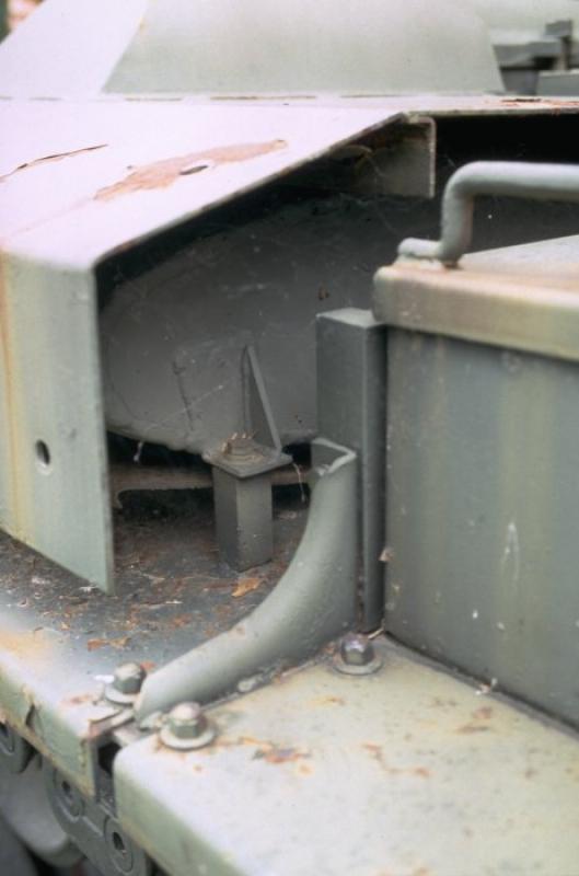 Darauf sieht man die Verstrebung , die von der Motorraumabdeckung in Richtung Auspuff geht, darüber ist nochmal eine Blechabdeckung , die über den Auspuff geht und mit Blechlaschen an der Motorraumabdeckung befestigt ist.