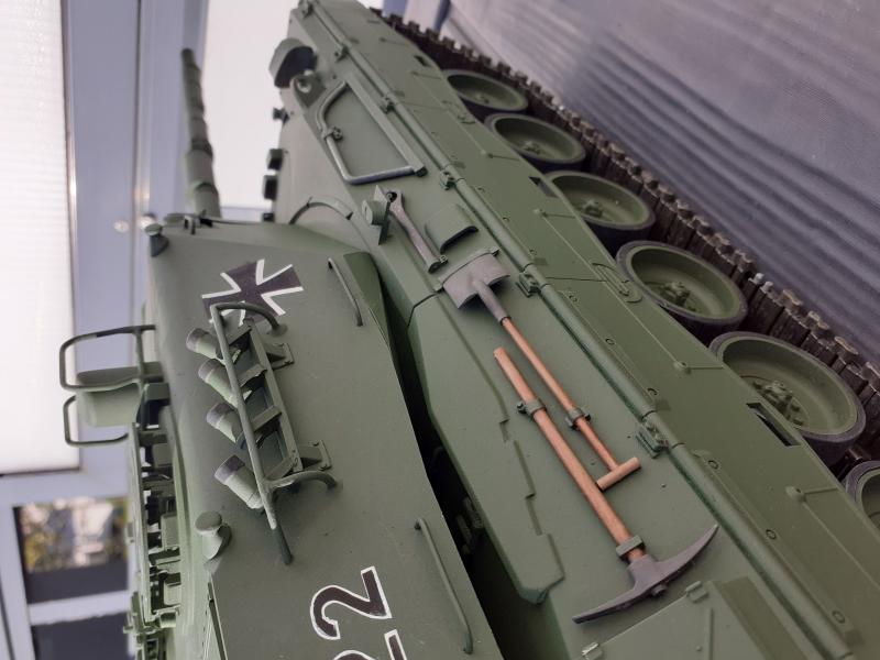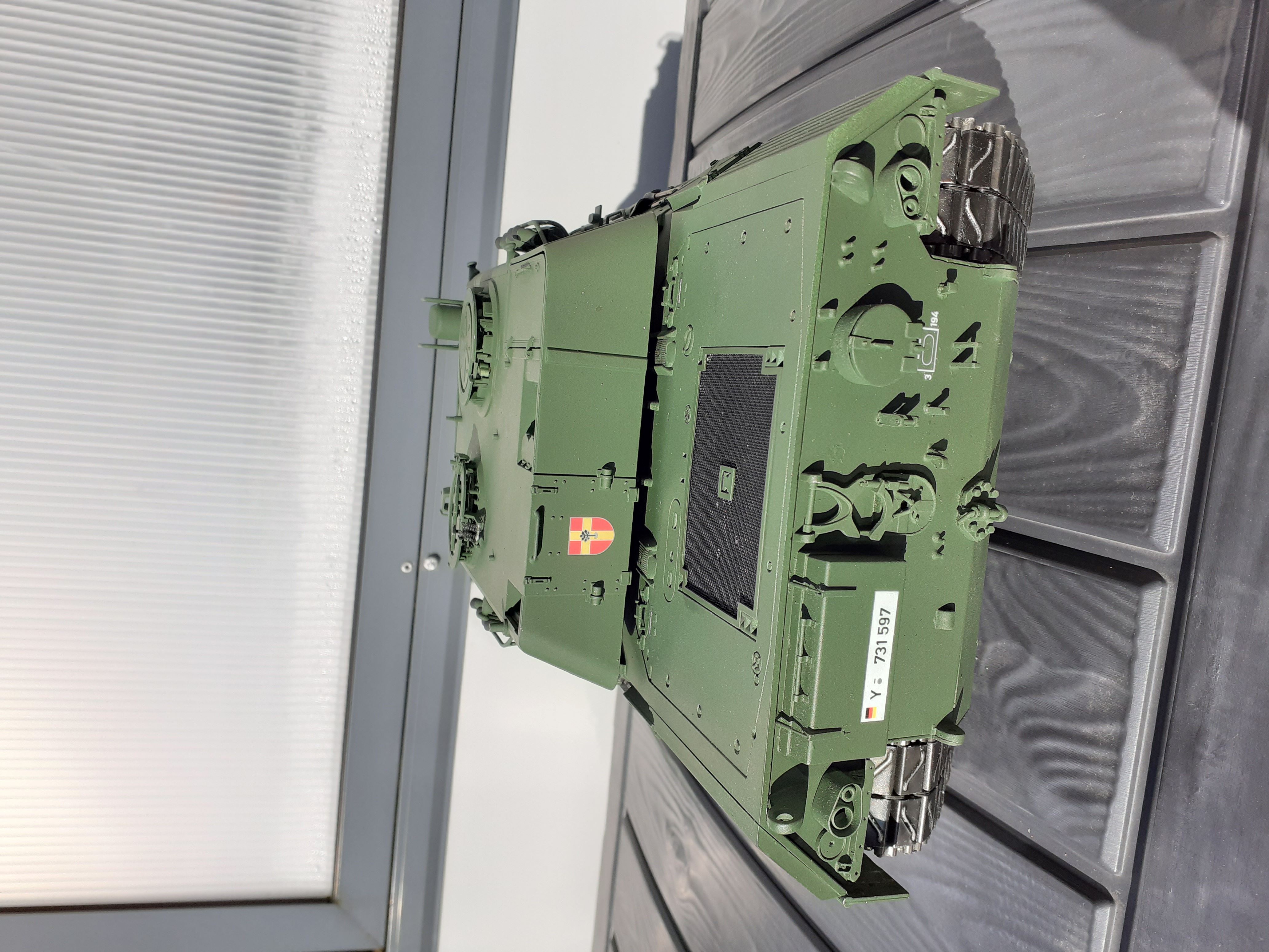 ich muss mich leider von einigen Modellen trennen .Ich biete euch heute ein Standmodell den Leo 1A4 Maßstab 1:16 von Tamiya an . Er ist nicht orig. aus dem Baukasten . Ich habe die Laufräder aus Alu gedreht , die Rückwand ist komplett aus Alu und AFV Zubehör. Die Gummi Verkleidung zwischen Turm und Kanone ist gerissen aber ansonsten ist er Top siehe Bilder . Wie schon erwähnt handelt es sich um ein Standmodell kann aber durchaus zu einen RC Panzer ausgebaut werden . Der Preis verhandelbar . Ich möchte gerne 400 € haben . Ich versuche mal ein paar Bilder einzustellen ansonsten schicke ich bei Interesse Bilder per E- Mail .