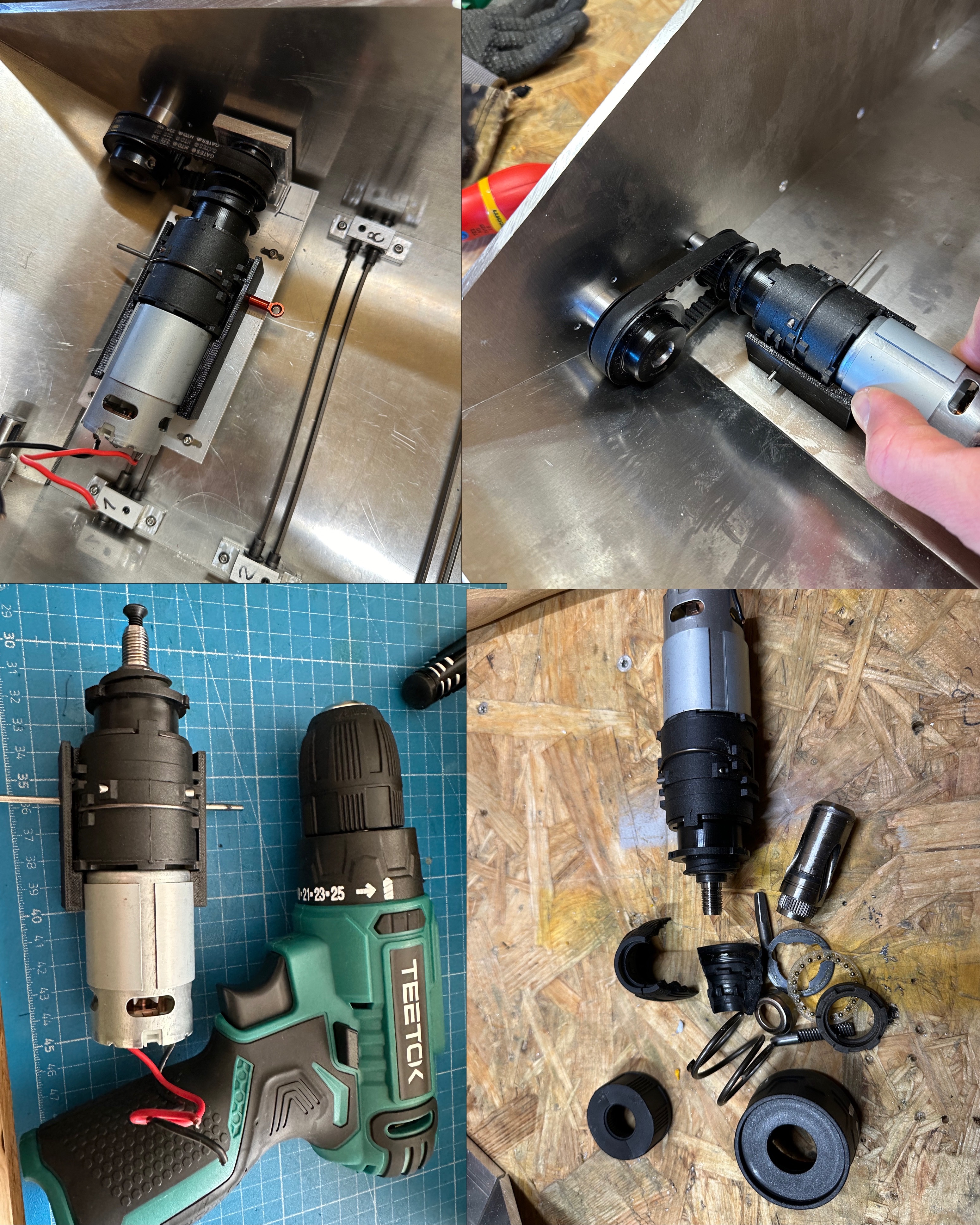 Den Antrieb habe ich aus 2 billigen 12v Akkuschraubern gebaut. Evtl kann ich sogar die Gangschaltung davon nutzen. Da die Akkuschrauber nicht für seitliche Lasten taugen habe ich noch einen Lagerbock gefräst und dann die HTD5 Zahnriemenscheibe eingebaut. Eine passende Halterung für Motor und Getriebe habe ich gedruckt.