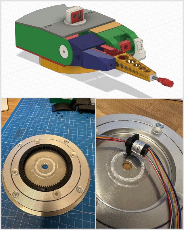 Jetzt kommt der Turm dran. Also Drehantrieb nehme ich einen Getriebemotor und einen gedruckten Zahnkranz. Das ganze wird in einem billigen Drehteller eingebaut. Es sollte ja keine großen Zugmomente wie bei einem Kran oder Baggerdrehkranz auftreten.