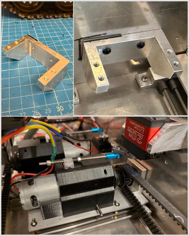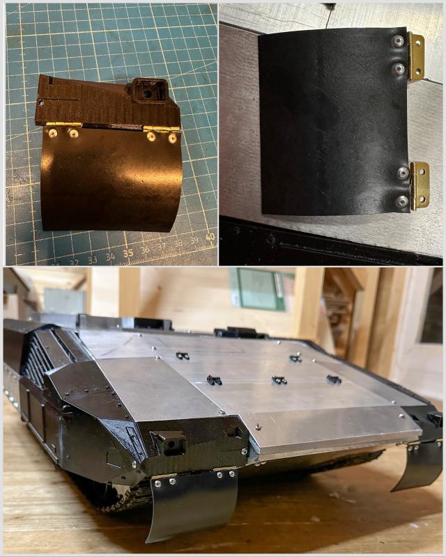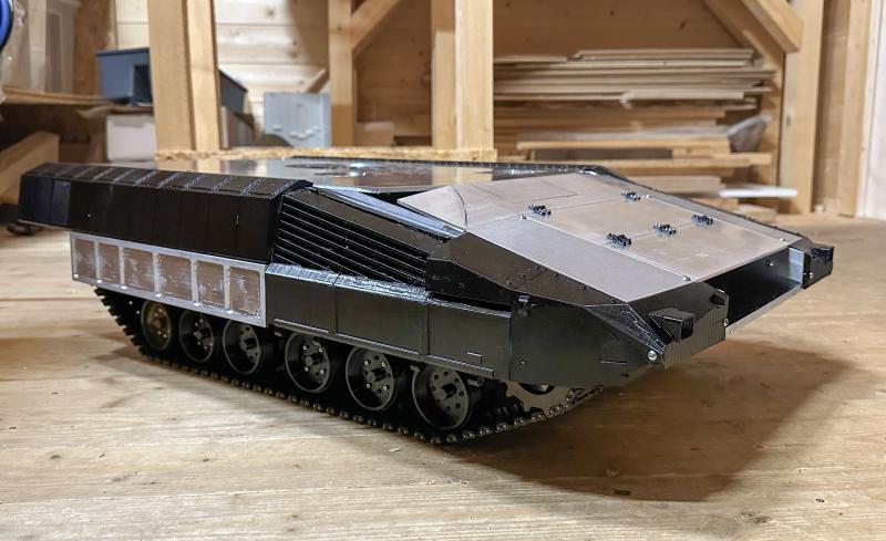 Die ERA Panzerung a den Seiten und an der Front ist gedruckt und installiert. Die unteren Teile für hinten sind aus einem Alu L Profil mit Aussparungen gefräst. Die Motorhaube habe ich aus 3mm Alu Platten gebaut. Die Scharniere zum aufklappen sind auch gedruckt und sofort kaputt gegangen. Die werden noch aus Alu oder Messing gemacht.