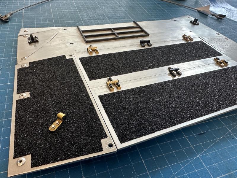 Jetzt geht es ein bisschen an die Details. Die “Motorhaube” habe ich mit Antirutschbelag beklebt. Ich werde wohl fast die ganze Oberfläche damit versehen. Passt farblich ganz gut zum jetzigen Farbschema in silber/schwarz.