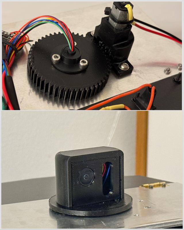 Das Peri mit FPV Kamera ist jetzt eingebaut. Um keine Probleme beim drehen zu bekommen habe ich auch hier eine elektrische Drehdurchführung eingebaut. Angetrieben wird was Ganze von einem winzigen Getriebemotor und einem gedruckten Zahnkranz.
