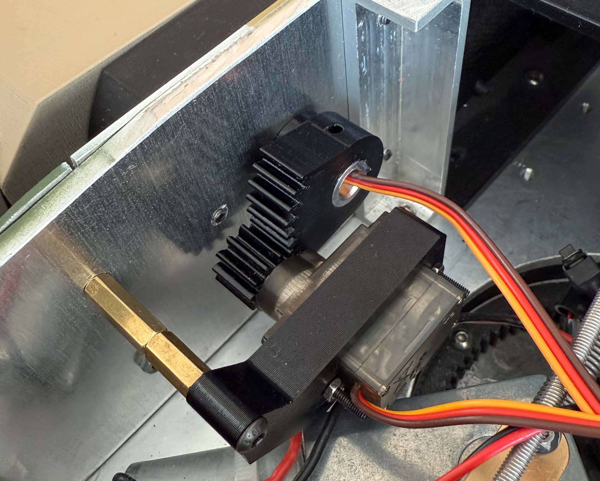 Jetzt geht es mit Details weiter. Ich habe mit einem kleinen Servo und gedruckten Zahnkranz/Zahnrad die Vorrichtung um das MELLS zu neigen gebaut.