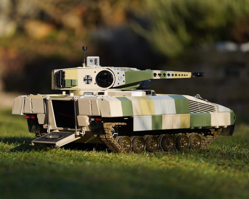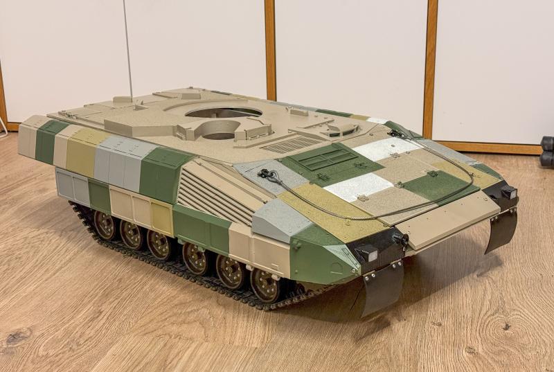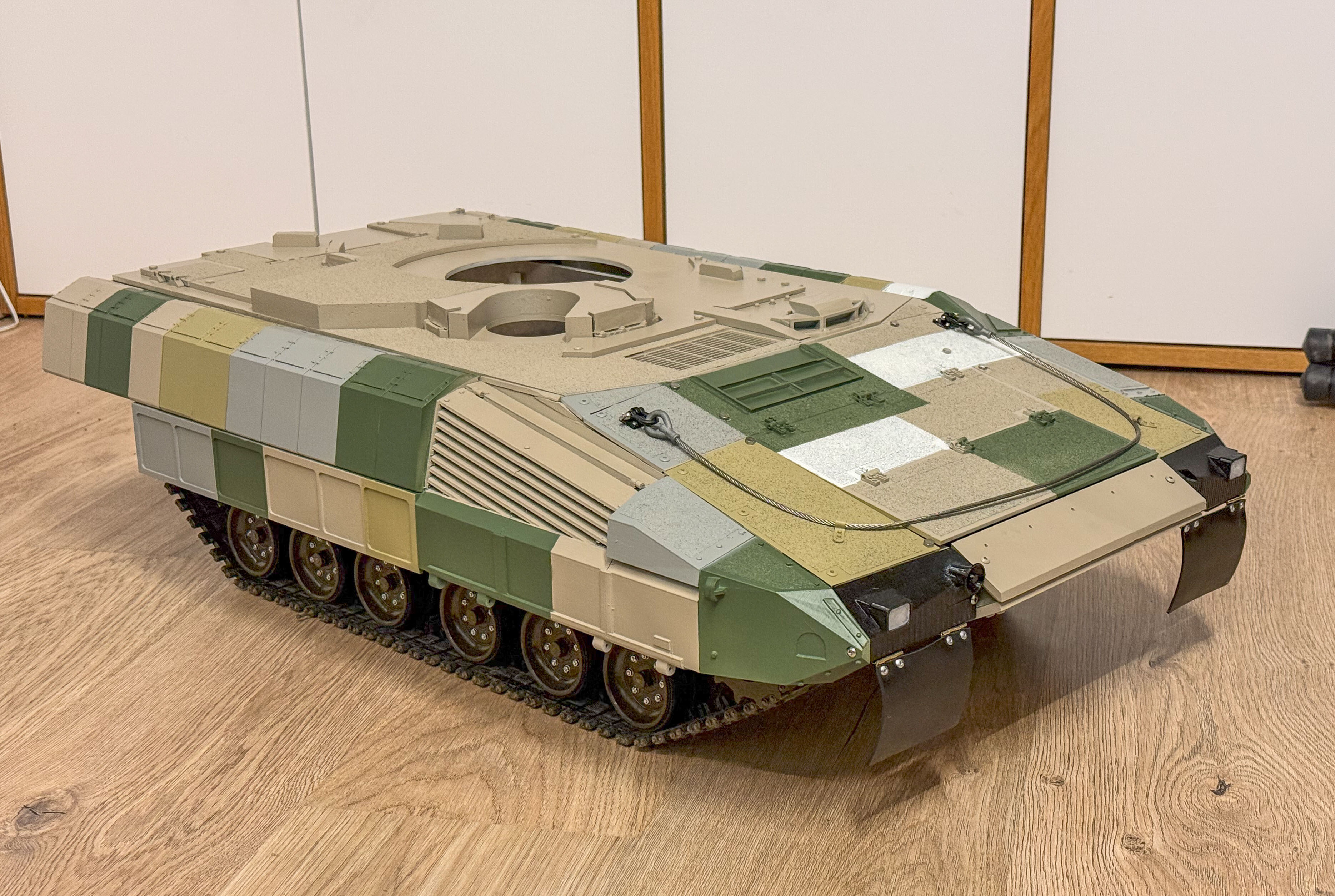 Ich habe mit dem Puma ein bisschen den Garten umgegraben und dabei festgestellt das er sehr häufig die Kette schmeißt, vor allem im Gras und bei Kurvenfahrten am hang. Wenn der Panzer mit der seitlichen Reaktivpanzerung, der Platte oben und dem Turm kommen noch mal ca 15kg dazu. Da muss ich an der Federung noch ein bisschen was umbauen und einstellen. Die Vorspannung der verbauten Drehstäbe ist nicht ganz so einfach einzustellen.