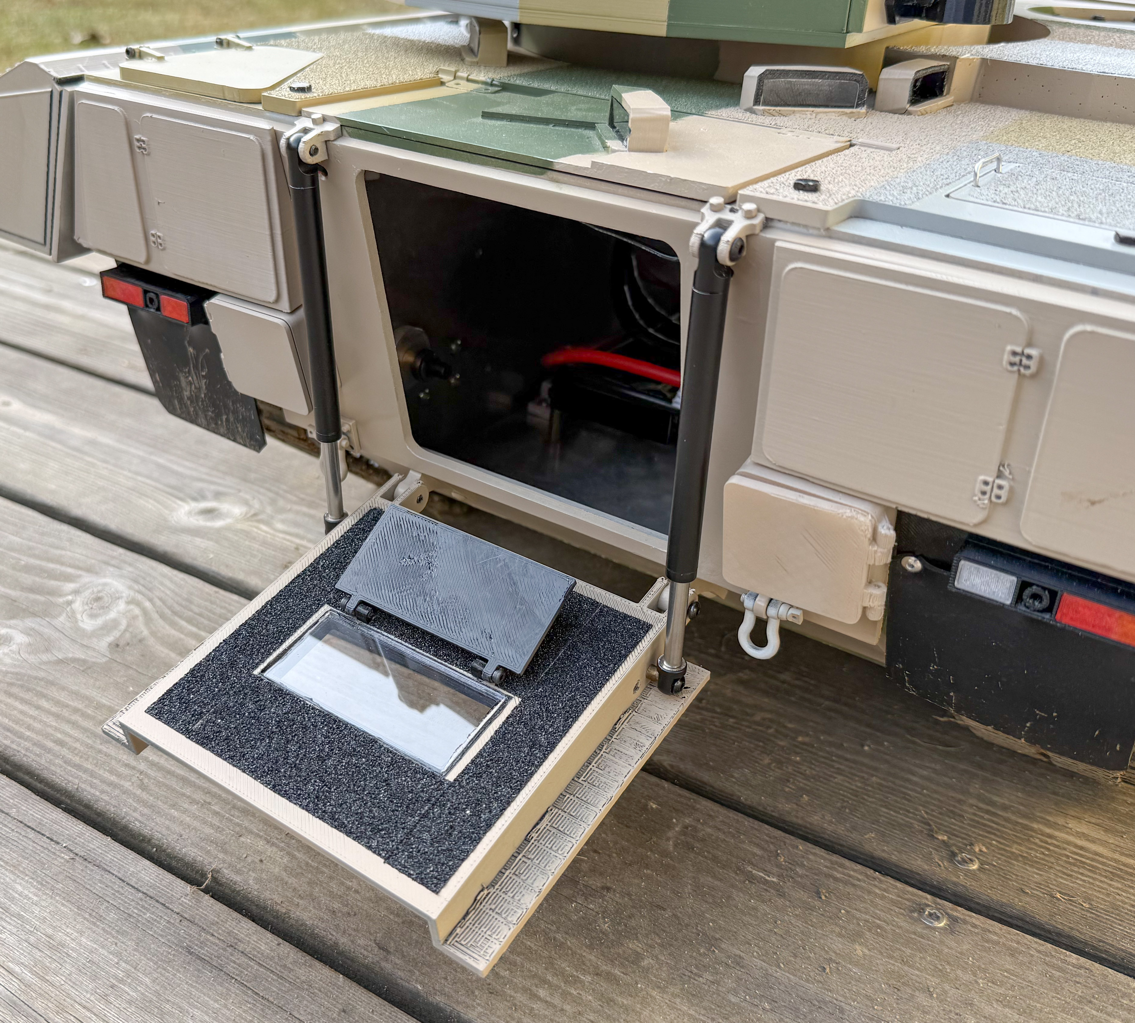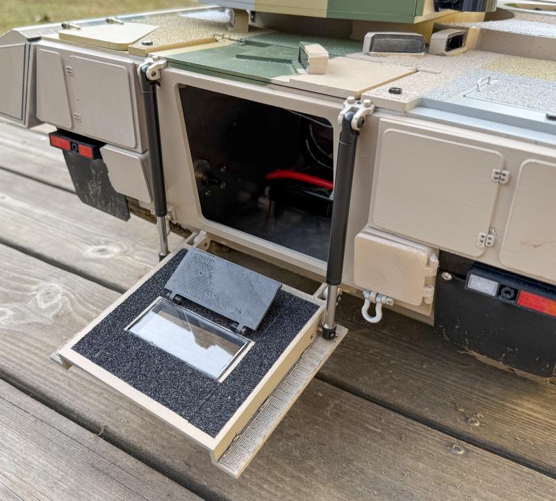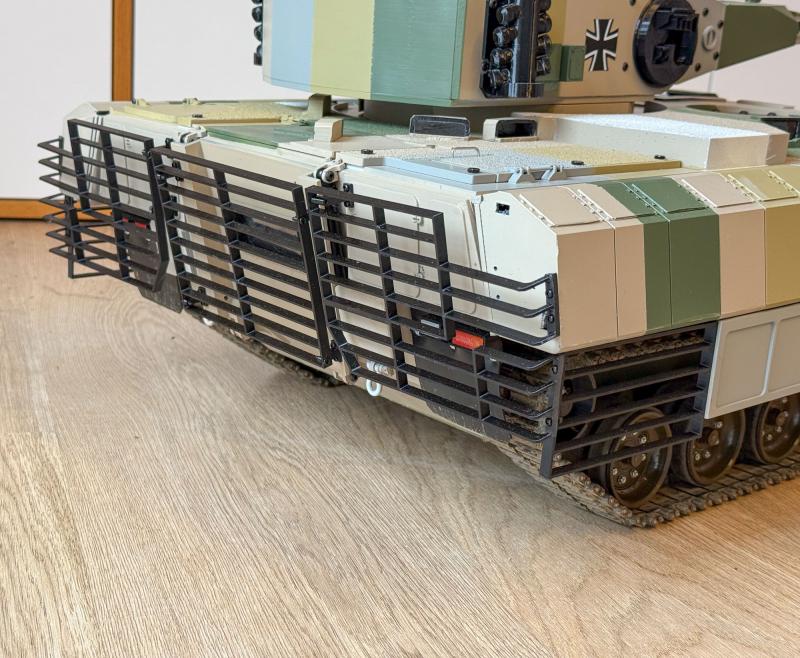 Ich habe jetzt mit der Gitterpanzerung am Heck weiter gemacht. Da muss ich bei der Geländefahrt jetzt schon ordentlich aufpassen nirgends rann zu kommen. Besonders stabil ist das nicht. Dafür aber durch den 3D Druck relativ einfach zu ersetzen.