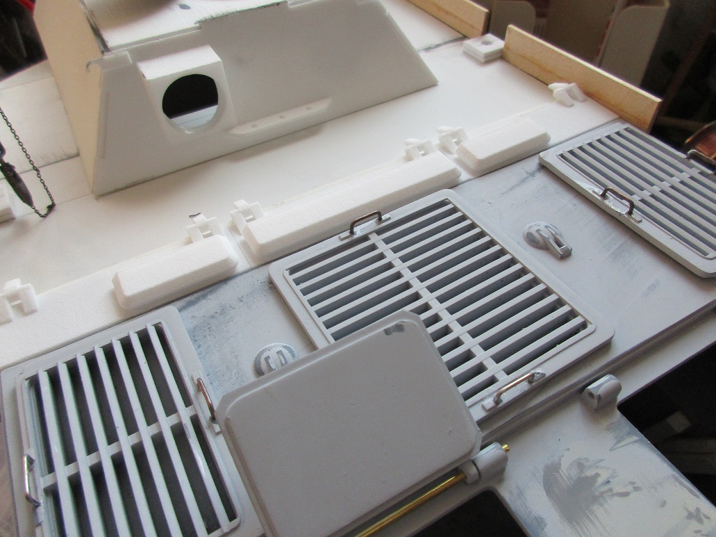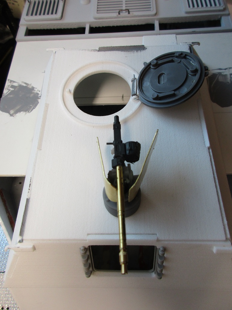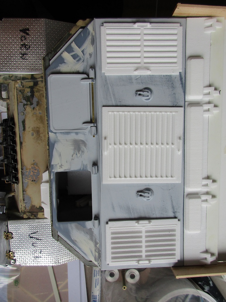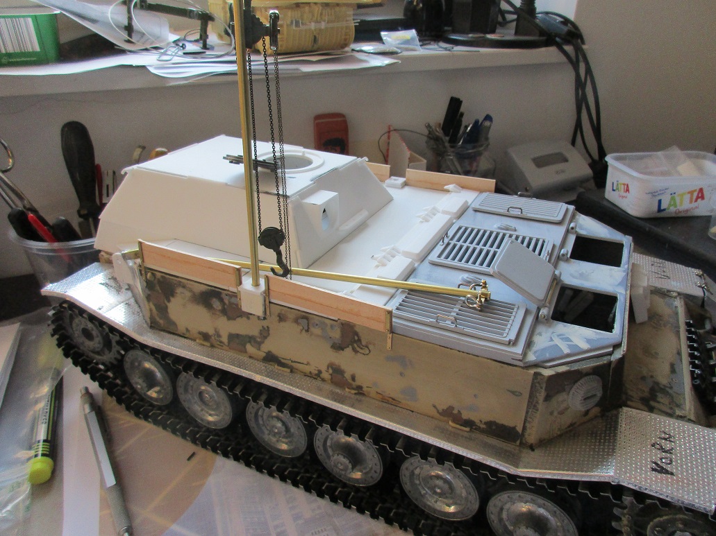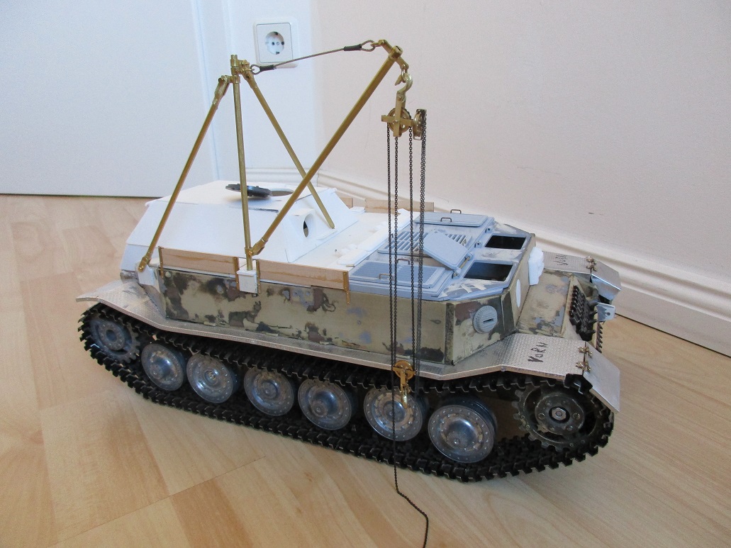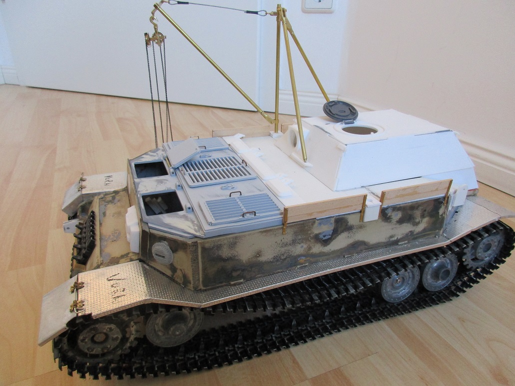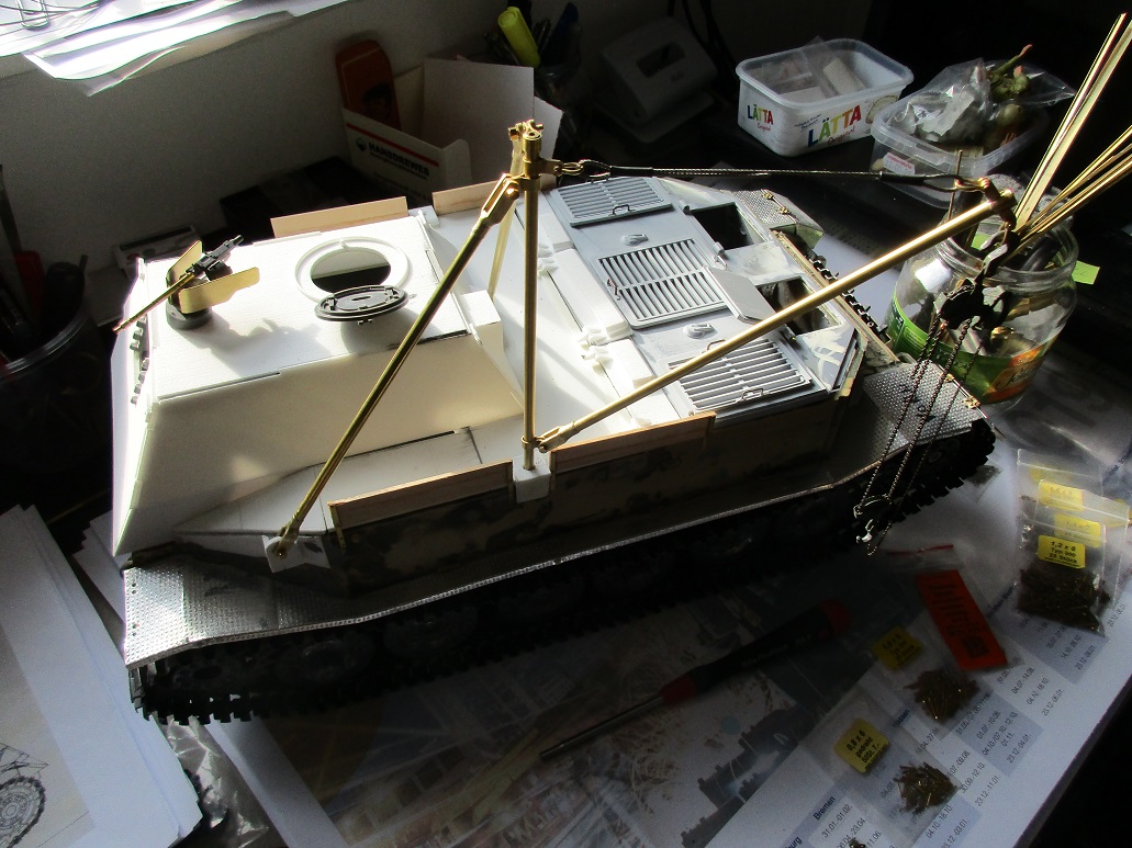 Der Berge hat einen Fahrersehschlitz wie Tiger 1. Dazu hab ich die Abdeckungen der (ich denke) Ventilatoren der Motorentlüftung/Kühlung (?) mal neu gemacht. Ich wurde gebeten die Gitter der Motorabdeckungen noch mit geneigten Lamellen zu versehen statt der wohl der Entformung geschuldeten senkrechten Lamellen des Modells. Aktuell "quäle" ich mich am Gestänge und Flaschenzug des Krans. Auf dem Bild ist der Flaschenzug von meinem Bergepanther zu sehen. Der dient als Referenz. Basteln ist angesagt.