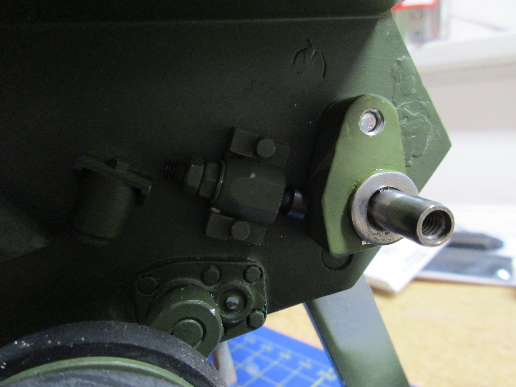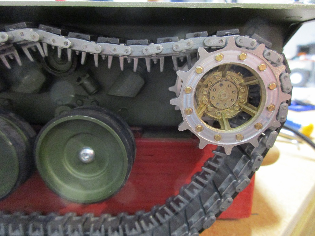 Mittlerweile habe ich AFV Kettenspanner und AFV Antriebskettenräder verbaut. Als Adaption der AK Räder habe ich sie "ausgebüchst" mit Rohren damit sie auf die Welle der Antriebsmotoren passen. Dann die Bohrungen der Madenschrauben durch die Buchsen, so kann das fixiert werden. Ein Räumschild hatte ich nicht, weshalb ich ein neues konstuierte für die "Müller" Arme. Wobei mir hier auffiel- das PM räumschild wird von vorn durch das Schild in die Arme geschraubt. Die Schraubenlöcher und Senkschrauben später "weggespachtelt". Das habe ich anders gelöst. Bei mir kommen die Schrauben "unsichtbar" von unten.