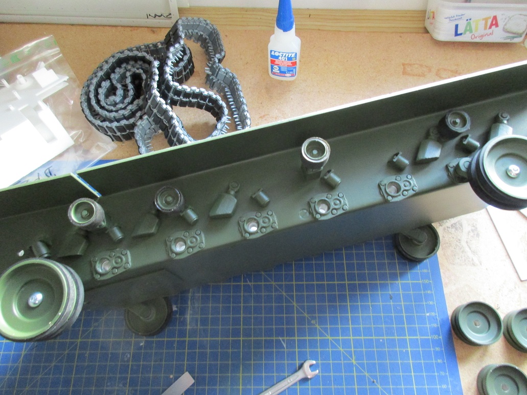 Begonnen wurde der Zusammenbau des Fahrwerks. Die Stützrollen habe ich durch Teile von AFV ersetzt.