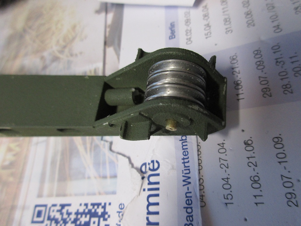 Am Modell ging es mit der Komplettierung des Kranarmes mit den bekannten Sicon Zyllindern und dem zugehörigen CTI Regler weiter. Die Rollen im Arm und der Kranflasche habe ich vom AFV Büffel übernommen. Im Arm musste der Bund der Rollen abgeschliffen werden dammit es passt. Dazu Kugellager, perfekt.