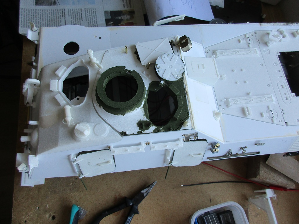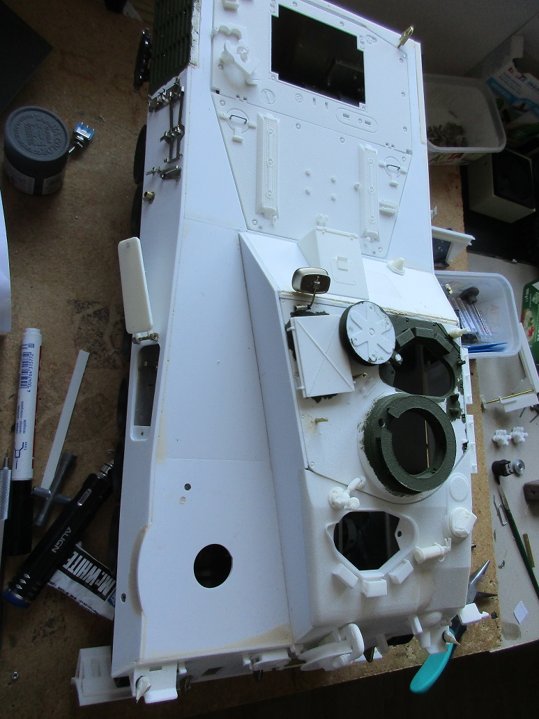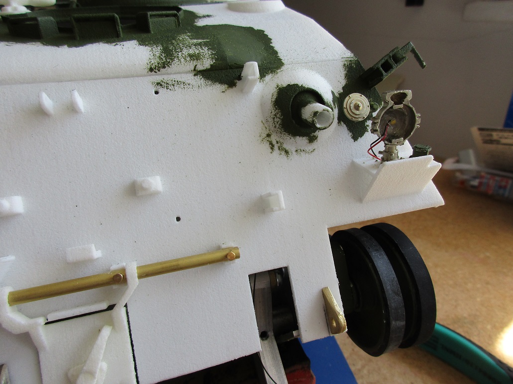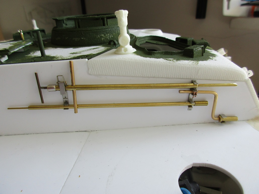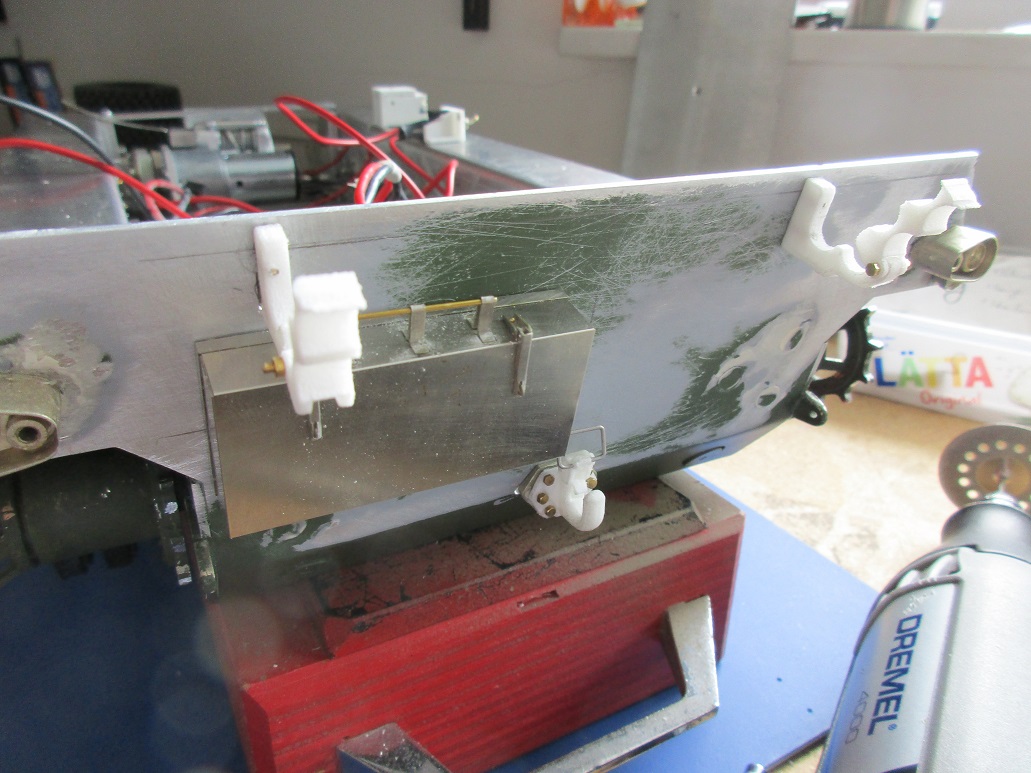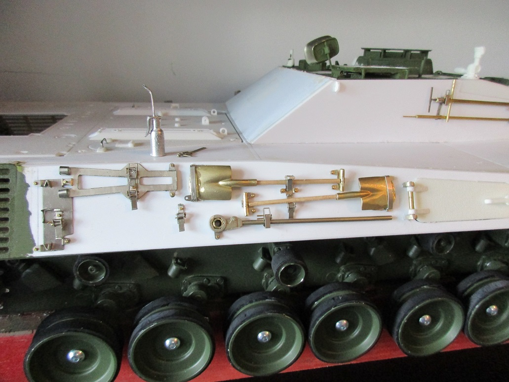 Aktuell bin ich dabei die gefühlt unendlich vielen Details anzubringen. Das Werkzeug an der Kasematte rechts dient glaub ich für Arbeiten an den Drehstäben. Wozu die Schaufeln sind weiß wohl jeder. Vorn gab es auch eine Hupe um sich Platz zu verschaffen. An der linken Wand der Kasematte die Aufnahme für das Hebegeschirr der Motorraumabdeckung. Korrekturen der Ansprache der Werkzeuge gern.