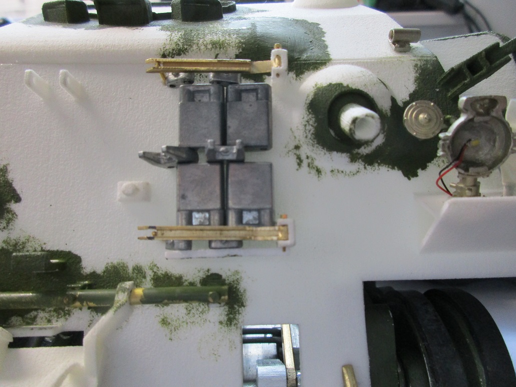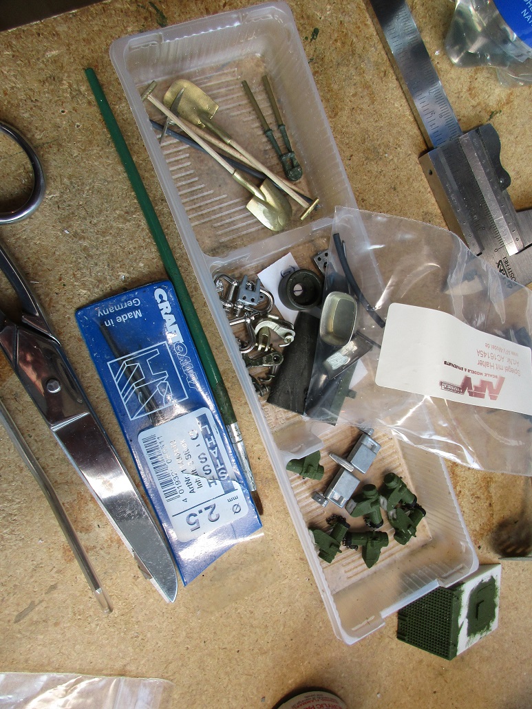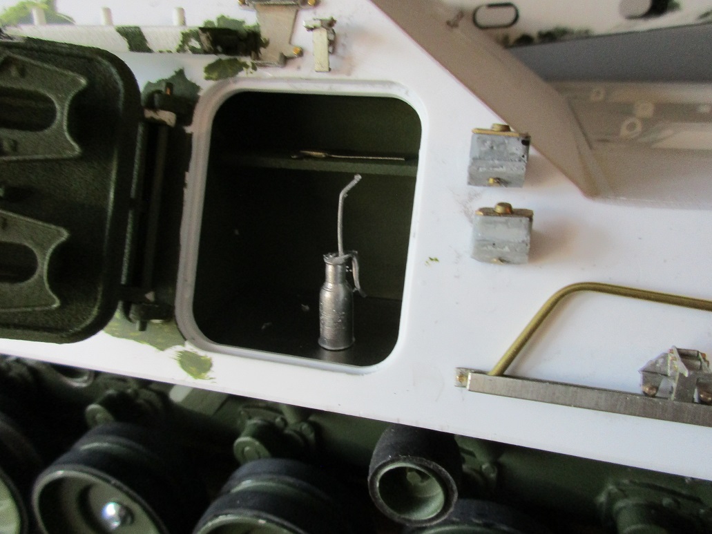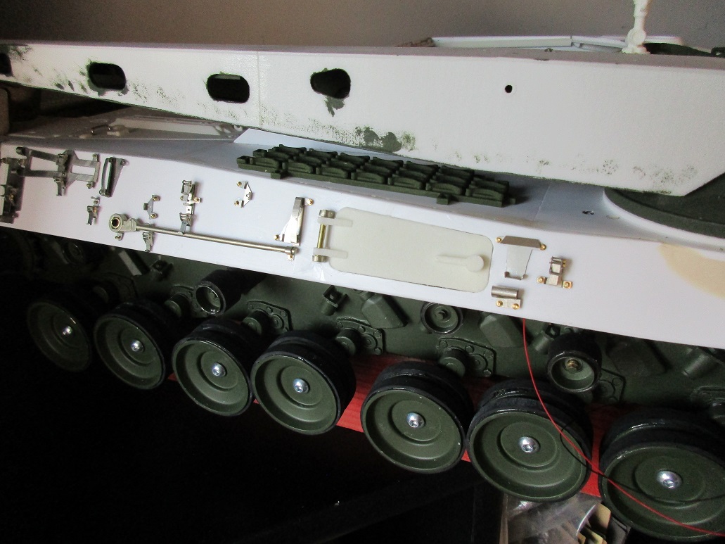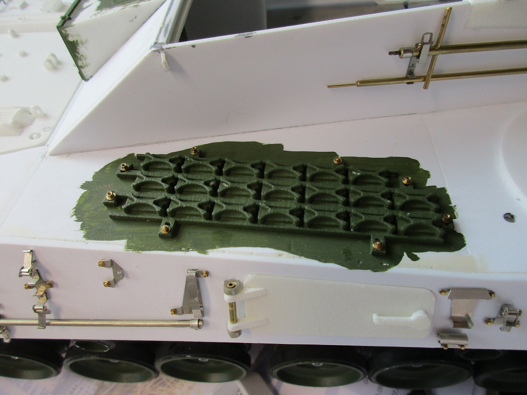 Platte mit den Eisgreifern- gedruckt, Schrauben und Muttern Messing. Staukasten Tarnnetz- gedruckt, eingelegt ein Metallgitter. Halter für Ersatzkettenglieder vorn- aus Messingprofil gearbeitet.