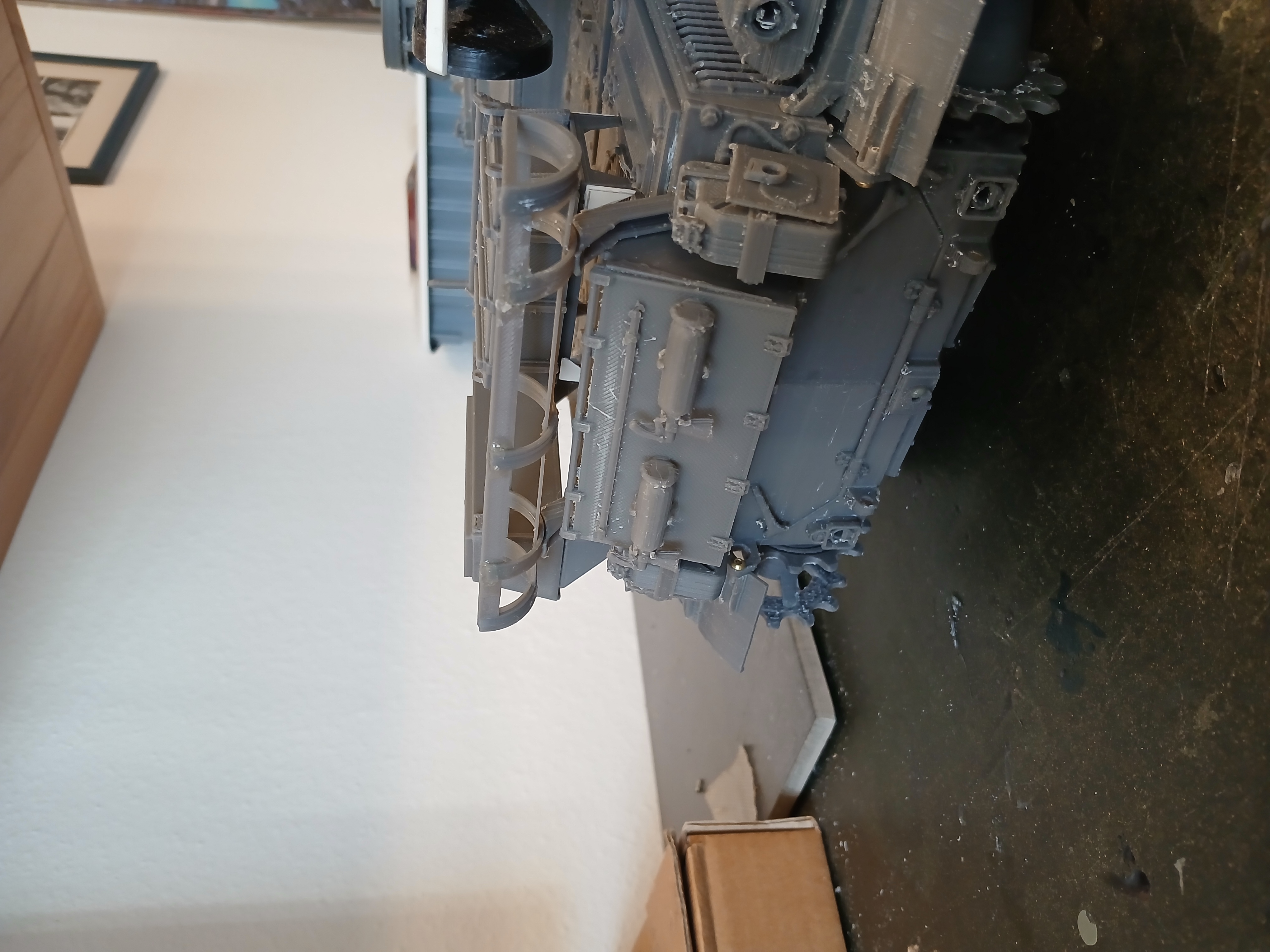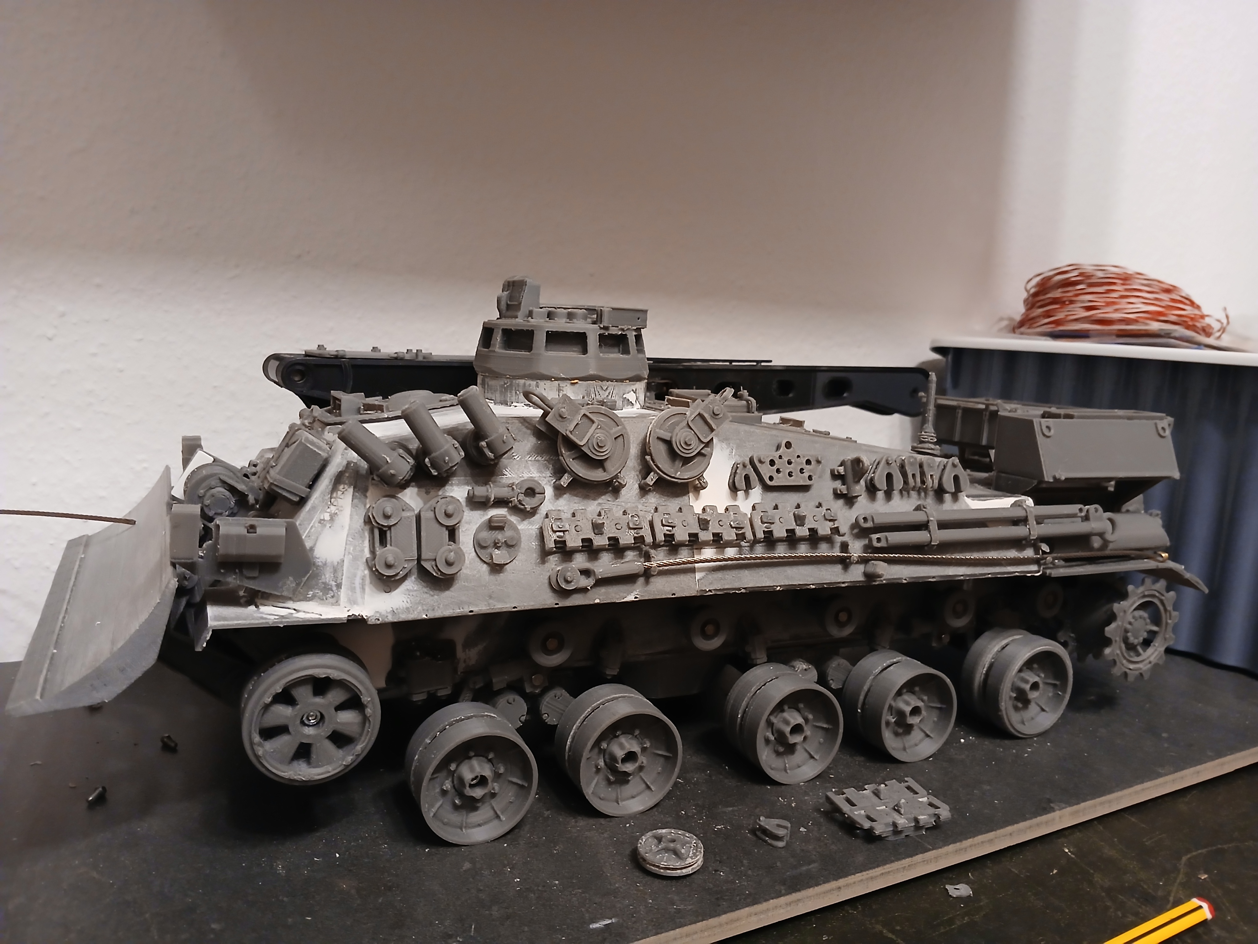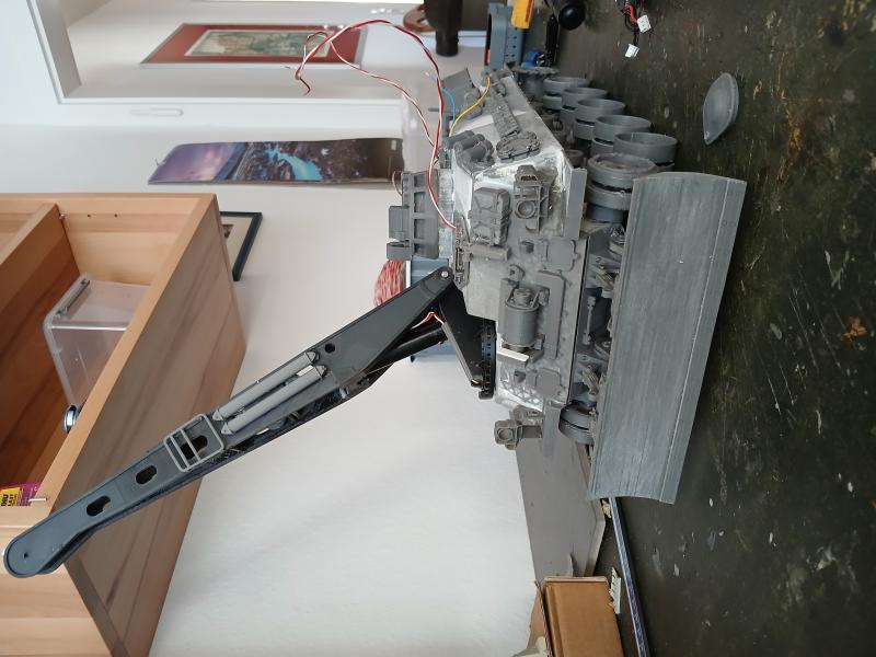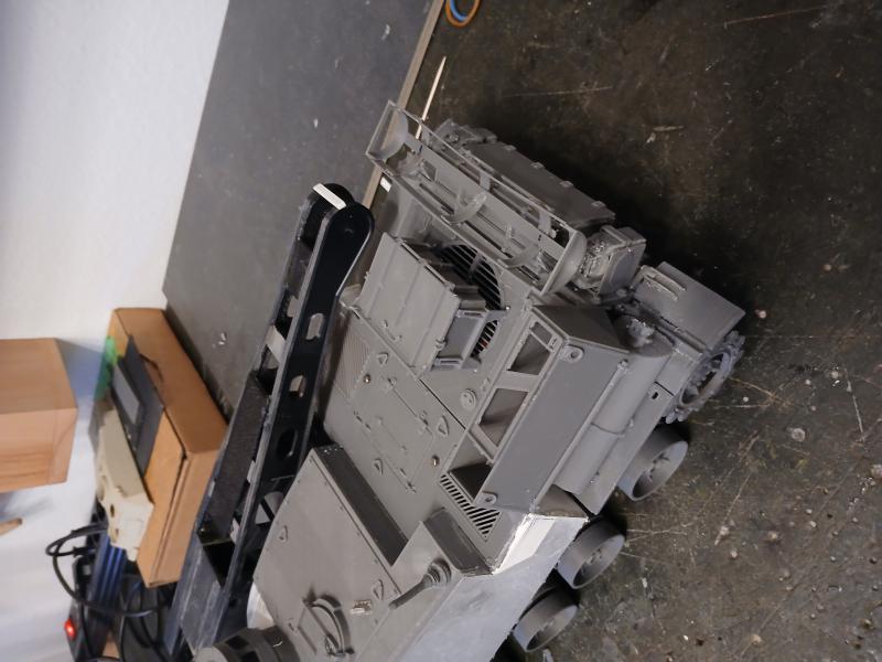 An der Frontseite sind jetzt noch die Scheinwerferhalter nebst Scheinwerfer und noch ein Kanister dazu gekommen.