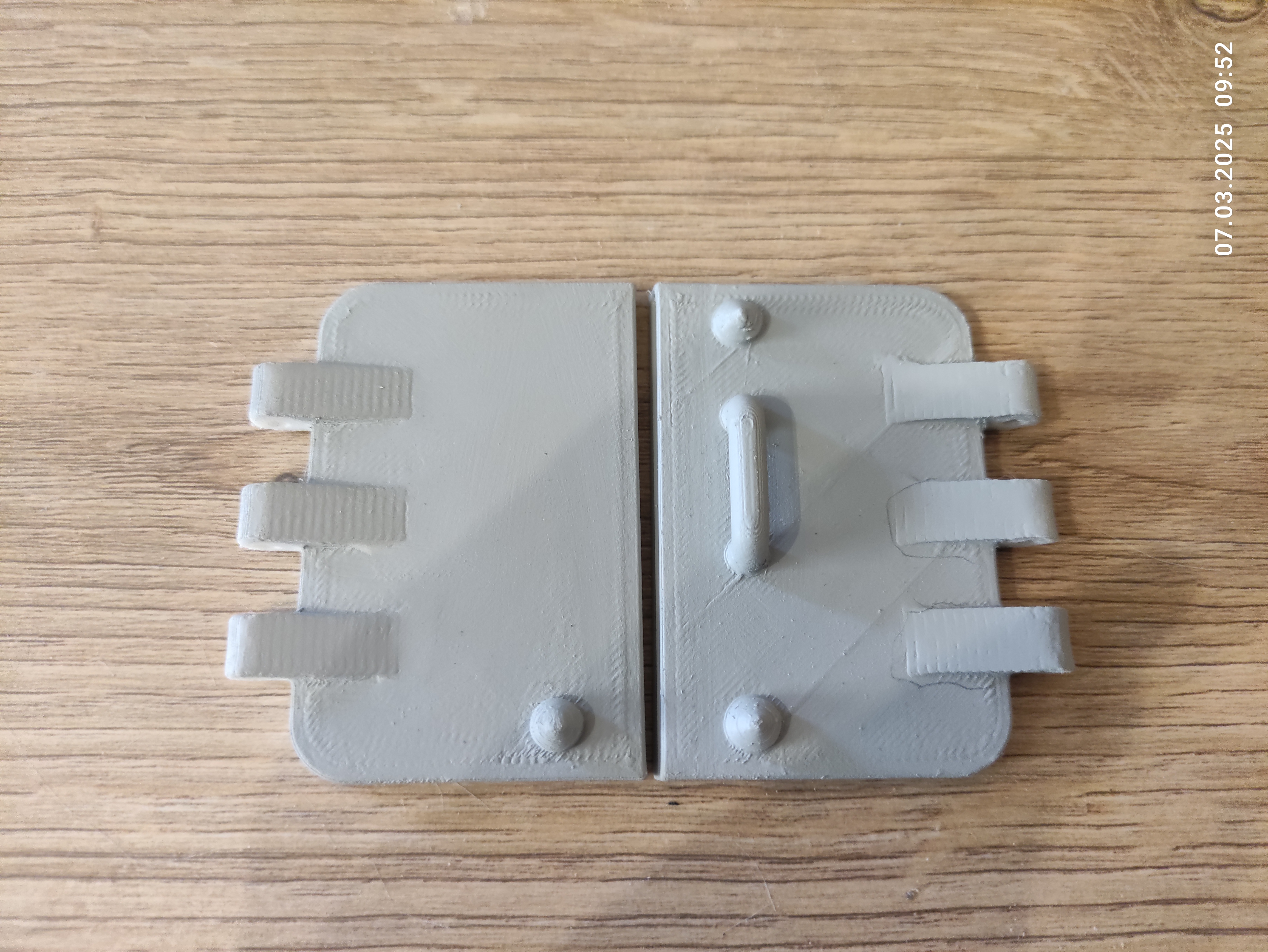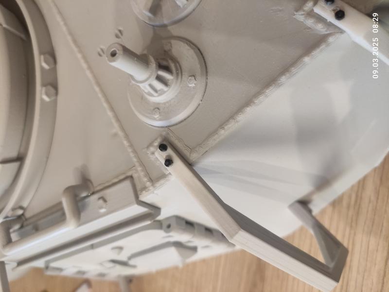 Die Halterung der Turmschürzen sollte eigentlich mit einer normalen Schraube erfolgen, hat mir nicht gefallen. Daher habe ich die Halter mit Madenschrauben befestigt und diese zugespachtelt. Fake Muttern gedruckt und an den Haltern angebracht. -- Königstiger PorscheTurm 1:10 im Bau, Panzer IV H 1:6 im Bau