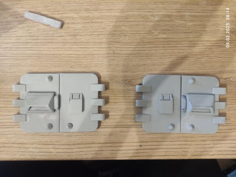 Da die ursprünglichen Türen am Turm nicht wie die von der H Version aussehen, habe ich versucht die Teile anhand eines 1/35 Modells auszumessen. Hat nicht zu 100% funktioniert, aber sieht denke ich schon besser aus. Tür alt. -- Königstiger PorscheTurm 1:10 im Bau, Panzer IV H 1:6 im Bau