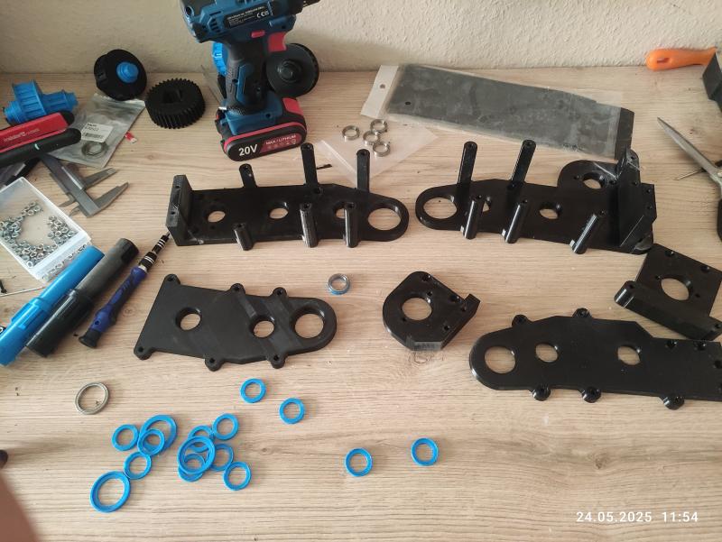 die Spachtelmasse an der Oberwannen ist am trocknen, da hab ich mir gedacht, fangen wir mal mit dem Getriebe an. Das wird denke ich die größte Herausforderung. Standard Zahnriemen passen nicht, Motor passt nicht in die vorgesehene Halterung und die Lager sowie Muttern ebenfalls nicht. Deshalb auch wie vorher die Einsätze für Lager und Muttern gedruckt. Den Zahnriemen werde ich denke ich auch drucken das ist aktuell noch eine skalierungsfrage.