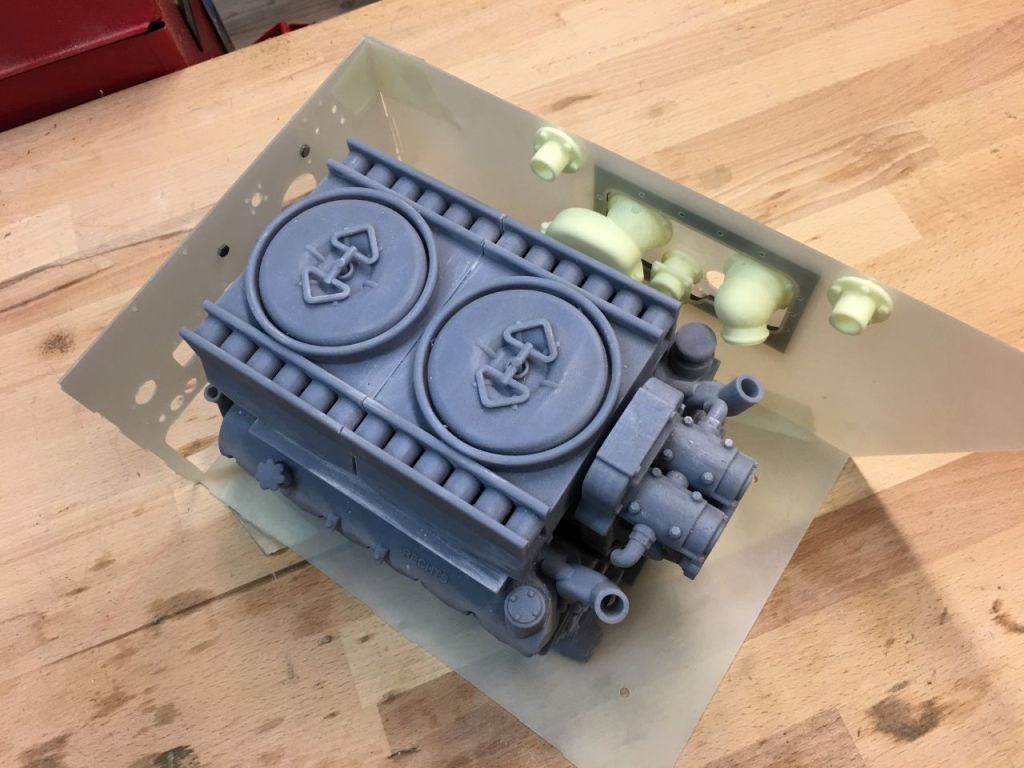 Im ersten Schritt habe ich die Motorklappe samt den Panzerungen überarbeitet, oder neu aufgebaut. Der Motor selbst ist von einem Kollegen im 3D Druck hergestellt.