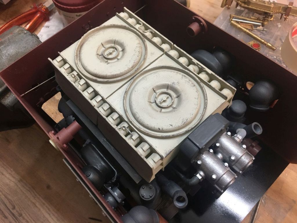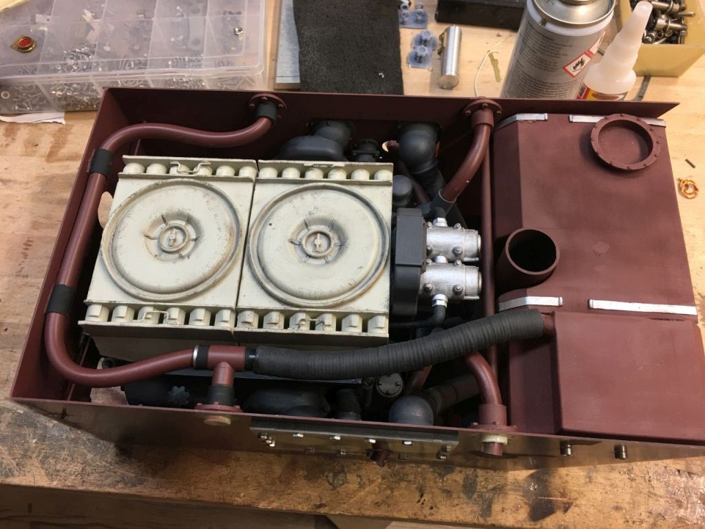 Anschließend kam etwas Farbe ins Spiel, danach ein paar Alterungseffekte und die Verschlauchung der Kühlwasserrohre.