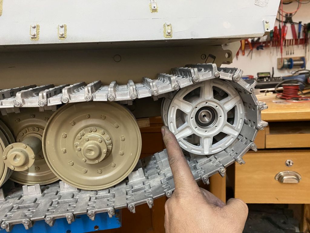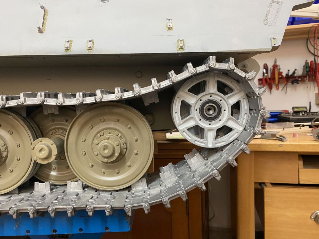 Diese Kette war eigentlich für den AT-Königstiger gedacht und hätte ohne Änderung auf dessen Laufwerk gepasst. "Natürlich" passten die Treibräder des Bigtanks-Modells nicht dazu, so dass ich die komplett neu anfertigen musste. Das war die Gelegenheit, die Zahnkränze abnehmbar zu machen, um sie als Verschleißteile getrennt von den Felgen wechseln zu können (bei Bigtanks normal nicht möglich). Um den Kohl fett zu machen, wurden dann auch gleich noch die beim Original experimentell verwendeten Spitzzahn-Treibräder nachgebaut, die zumindest beim Modell deutlich besser abrollen als die ursprünglichen. Bei den originalen Zahnkränzen von AT-Modellen habe ich schon ab und zu unter Last Überspringer gesehen.