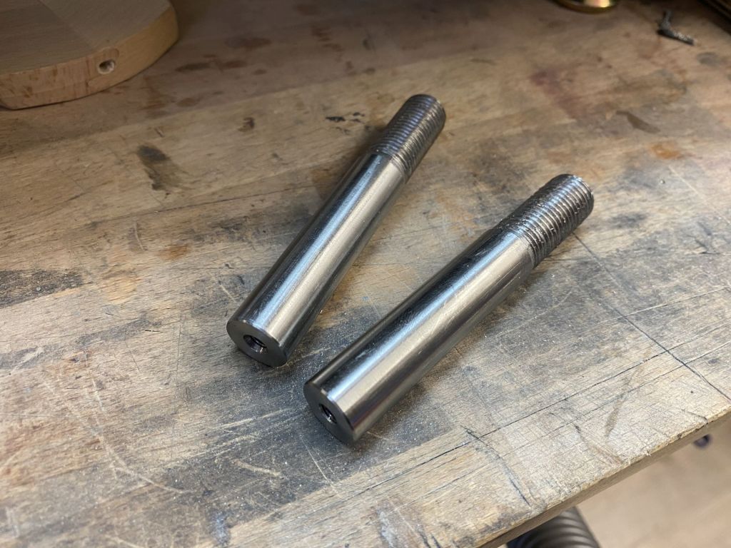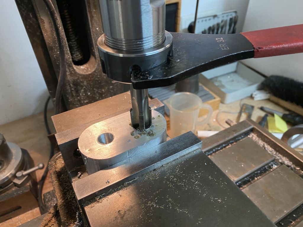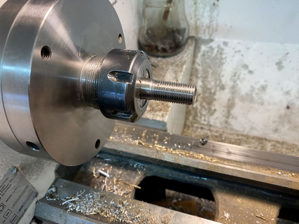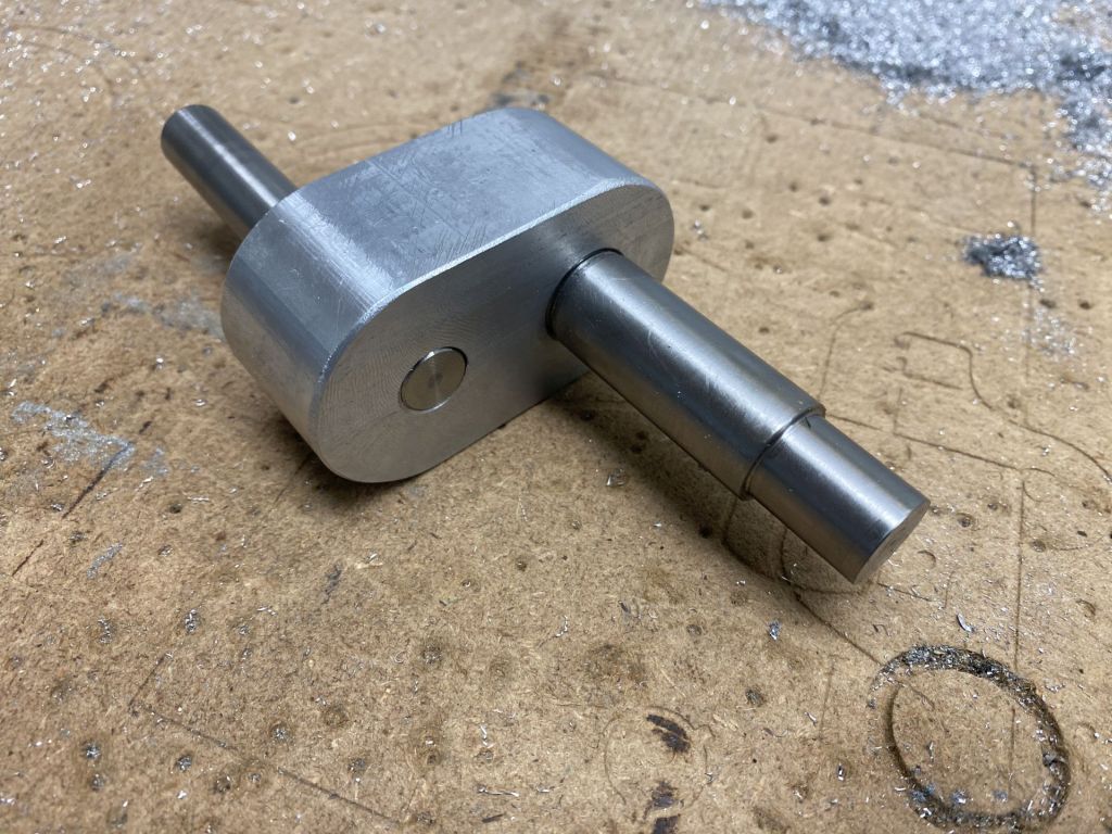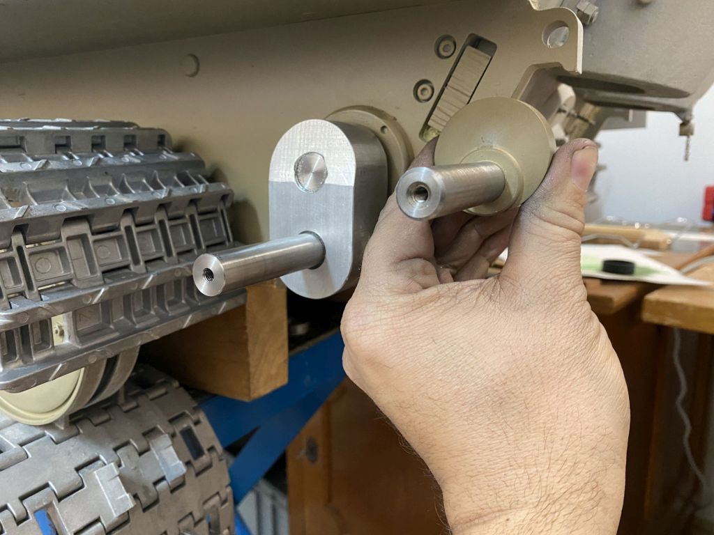 Was mir erst recht spät aufgefallen ist, war die Position des Leitrads. Selbst teilgespannt ist es viel zu hoch, sodass die Kette fast an der Wanne schleift. Als Bonus reicht die Spannung nicht aus um eine vernünftige Kettenspannung einzustellen. Also Literatur, Pläne und Bilder durchforstet und das passende Maß für den Exzenter der Kettenspannung ermittelt. Die Achsen sind 16mm und 18mm im Durchmesser. Was bei der Herstellung schon grenzwertig mit meinen Maschinen war. Mit viel Armpower und Schneidöl war es dann aber zu schaffen.