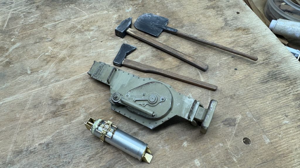 Über den Sommer hatte ich dann wenig am Jagdtiger gebaut, andere Projekte hatten Vorrang und mir fehlte auch einfach etwas die Lust. Im Herbst ging es dann weiter und ich baute alle Werkzeuge und die 20t Stockwinde. Der TETRA Löscher ist mit seiner Halterung eigentlich ein eigenes Modell. Die Verschlussklammer ist gangbar und hält den Löscher in der Halterung.