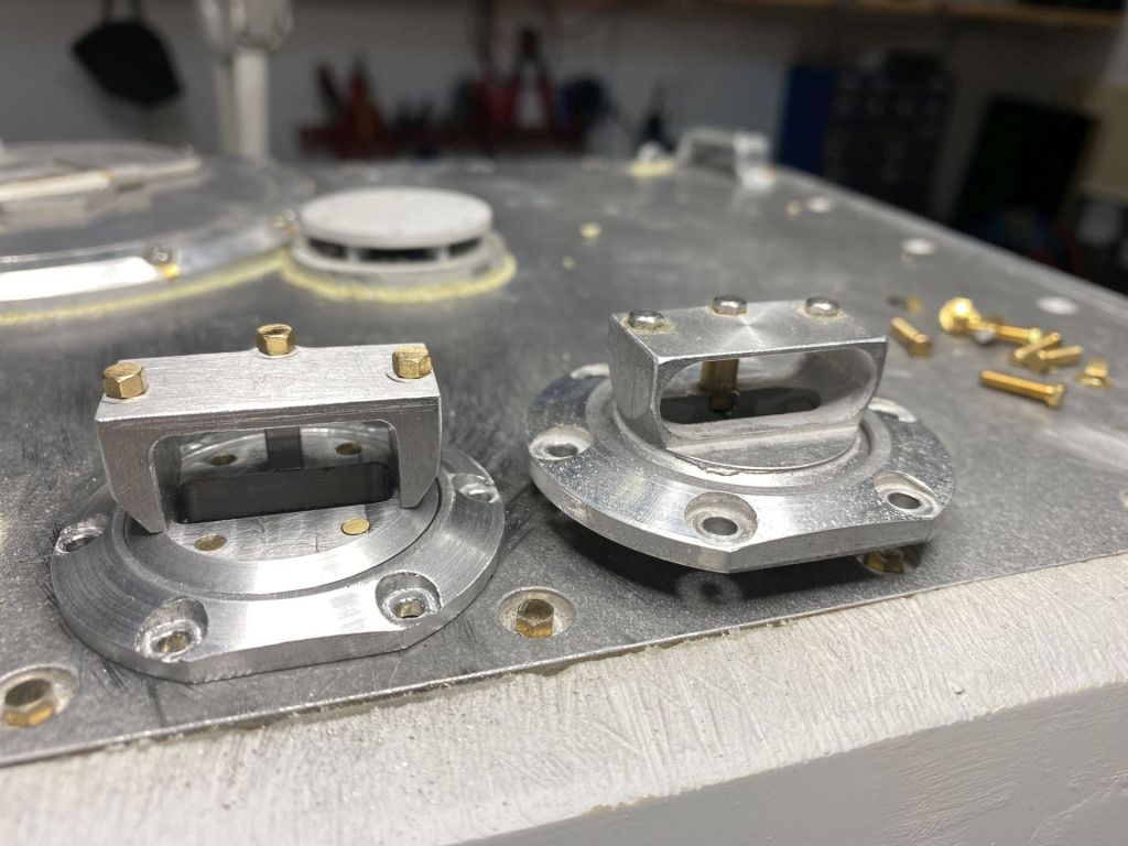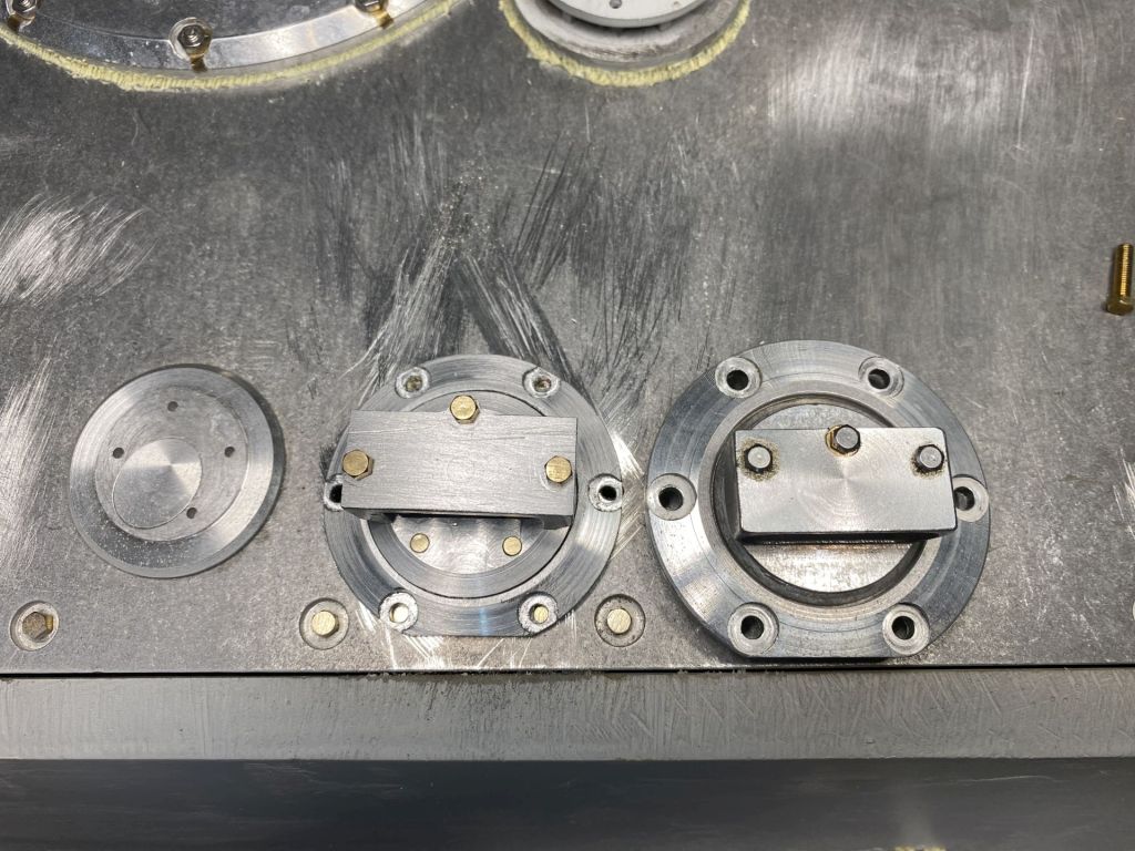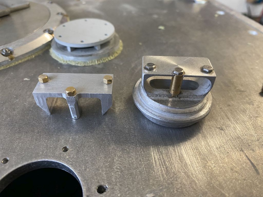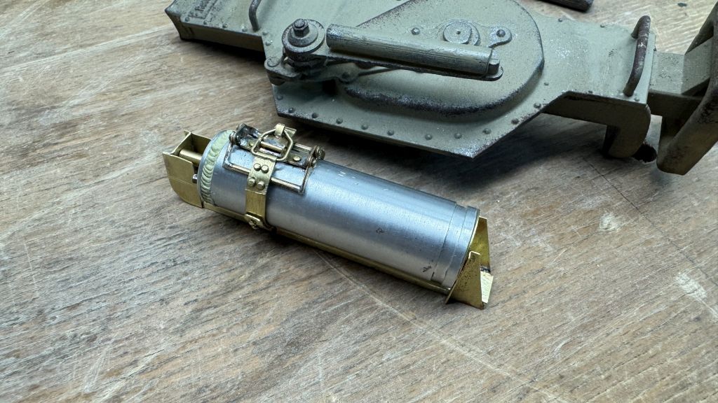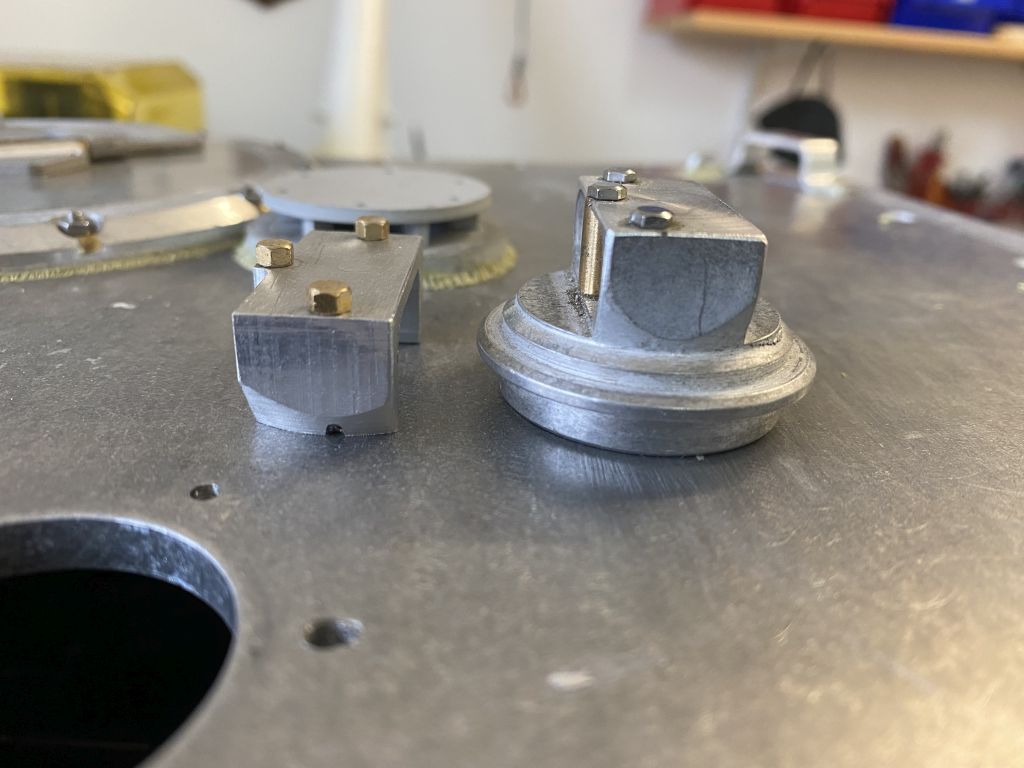 Als eine der letzten großen Änderungen habe ich mir den Winkelspiegel vom Kanonier vorgenommen, die Bausatzversion stimmt hier leider gar nicht. Das teil erwies sich dann komplexer als zunächst angenommen. Auf Fräse und Drehmaschine war es dann aber nach einer Woche Arbeit fertig. Seitlich sieht man die Gewinde der Schraubbolzen, das ist kein Fehler, sondern am originalen Spiegel ebenfalls zu sehen.