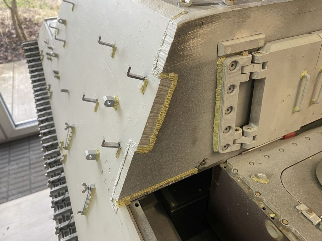 So war der Stand im Februar 2024, fast alle Halterungen waren angebracht. Als Walzstahlimitation habe ich Revell Feinspachtel benutzt, den aber auch nur in geringen Dosen, da die originale Oberfläche von 331 doch recht glatt ist. Was noch folgte war eine Schweißnahtorgie mit Milliput und anschließender Grundierung mit Etchprimer von Militärlacke.de.