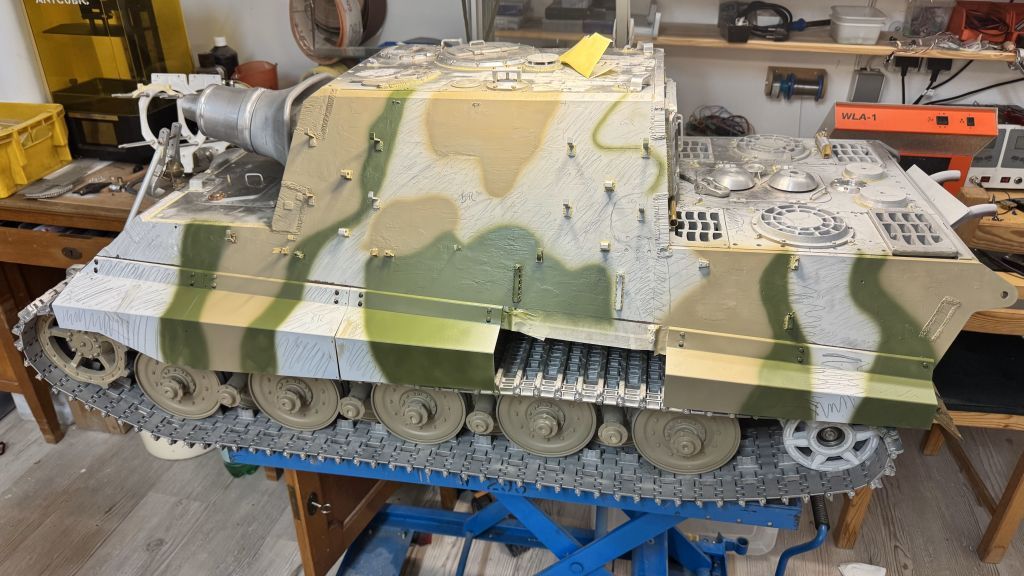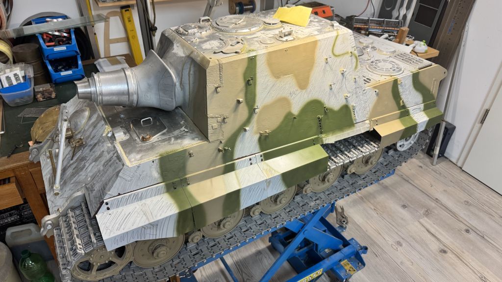 Über den Winter habe ich dann anhand von Fotos versucht das Tarnschema auf dem Modell zu rekonstruieren. Leider gibt es keine Bilder von den Horizontalen Oberflächen, daher habe ich an den Stellen nur die Tarnverläufe fortführen können die von den Seiten kommen. Als Farben sind die von Militärlacke zum Einsatz gekommen, das Dunkelgelb ist die Variante 1944. Die Rostschutzgrundierung unterhalb der Schürzen ist Tamiya "Hullred". Aktuell finde ich es etwa zu dunkel und nicht rötlich genug, da werde ich nochmal drüber lackieren.